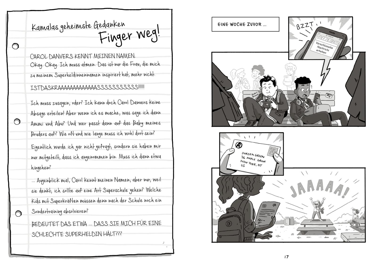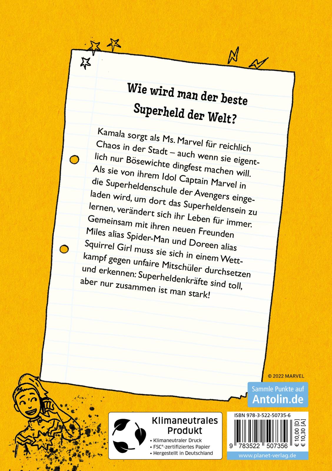 Als Ms. Marvel einen Brief von Captain Marvel, ihrem Idol, erhält, verändert sich ihr Leben schlagartig: Sie wird in die berühmte Superheldenschule der Avengers eingeladen. Auf ihrem Stundenplan steht jetzt unter anderem Unterricht bei Thor und ein superwichtiger Wettkampf. Gemeinsam mit ihren neuen Freunden Miles (Spider-Man) und Doreen (Squirrel Girl) bildet sie ein Team. Sie müssen sich ab jetzt gegen unfaire Mitschüler durchsetzen, alle Aufgaben bravourös meistern und lernen, dass man gemeinsam stärker ist als allein. Eine spannende Superheldengeschichte für alle Marvel-Fans und die, die es werden wollen!