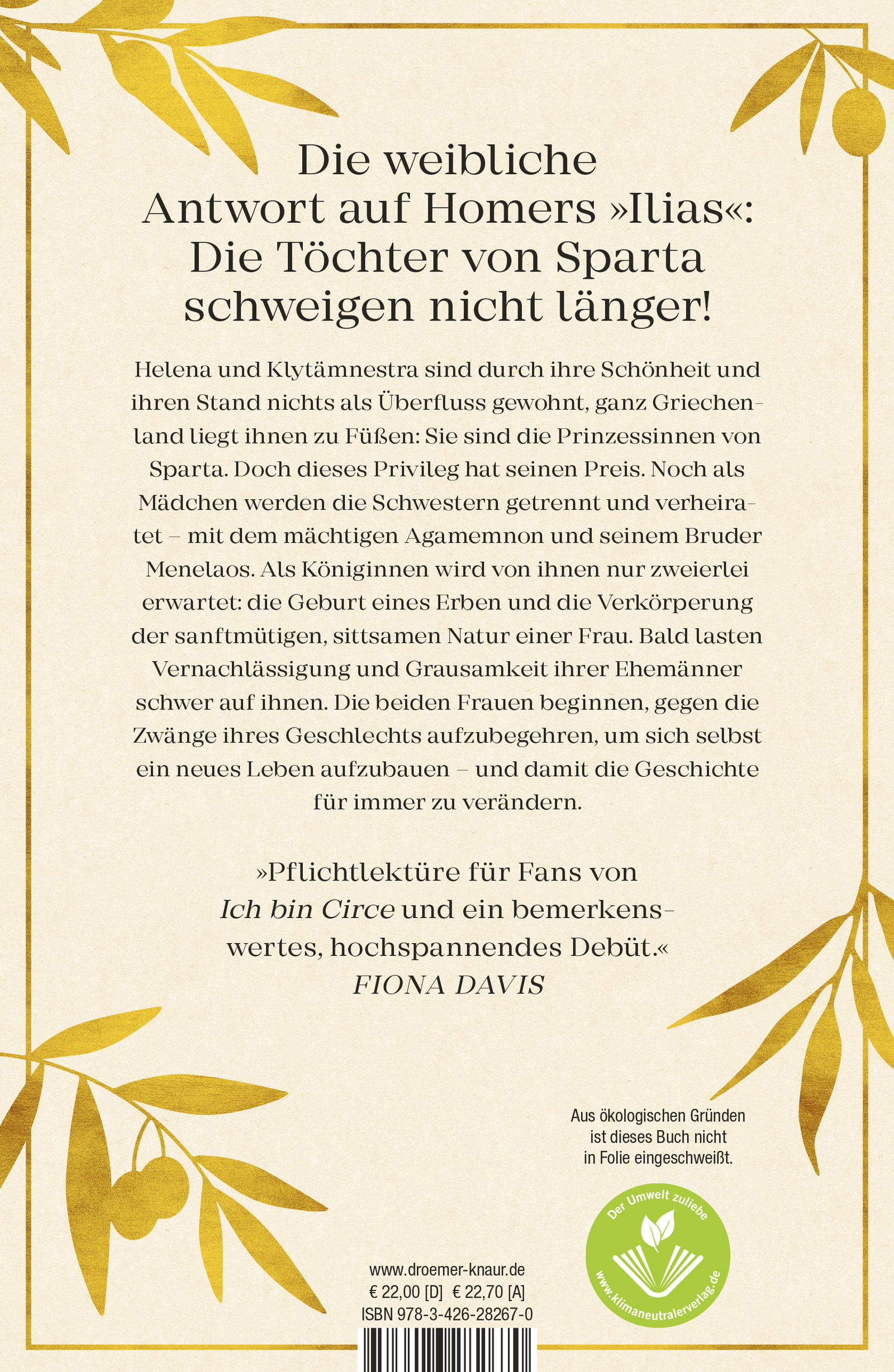 Helena und Klytämnestra sind durch ihre Schönheit und ihren Stand nichts als Überfluss gewohnt, ganz Griechenland liegt ihnen zu Füßen: Sie sind die Prinzessinnen von Sparta. Doch dieses Privileg hat seinen Preis. Noch als Mädchen werden die Schwestern getrennt und verheiratet - mit dem mächtigen Agamemnon und seinem Bruder Menelaos von Troja. Als Königinnen wird von ihnen nur zweierlei erwartet: die Geburt eines Erben und die Verkörperung der sanftmütigen, sittsamen Natur einer Frau. Bald wiegen die Vernachlässigung und die Grausamkeit ihrer Ehemänner schwer auf ihnen. Und somit finden sie sich an dem Punkt wieder, an dem sie gegen die Zwänge ihres Geschlechts aufbegehren müssen, um sich selbst ein neues Leben aufzubauen - und damit die Geschichte für immer zu verändern.