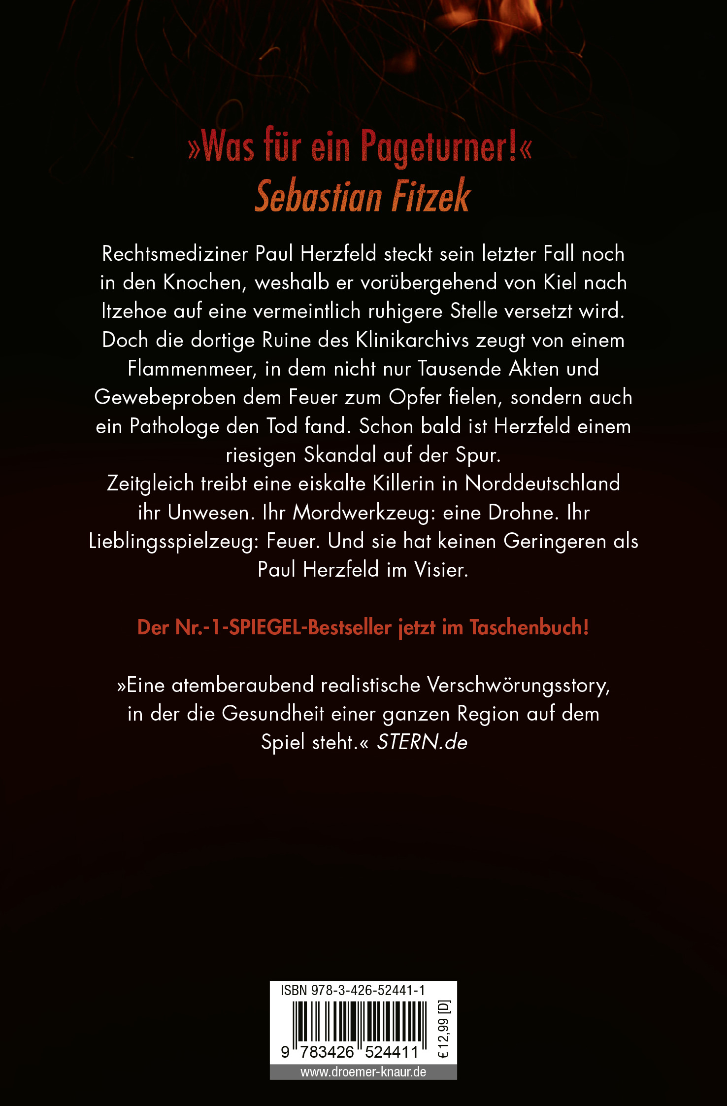 Rechtsmediziner Paul Herzfeld steckt sein letzter Fall noch in den Knochen, weshalb er vorübergehend von Kiel nach Itzehoe auf eine vermeintlich ruhigere Stelle in der Pathologie versetzt wird. Doch die dortige Ruine des Klinikumarchivs zeugt von einem Flammenmeer, in dem nicht nur tausende Akten und Gewebeproben dem Feuer zum Opfer fielen, sondern auch Herzfelds Vorgänger in der Pathologie den Tod fand. Ein Todesfall mit zu vielen Ungereimtheiten, wie Herzfeld findet. Und je weiter er nachforscht, desto klarer wird, dass er einem Skandal ungeheuren Ausmaßes auf der Spur ist. Die Gesundheit der Bevölkerung Norddeutschlands ist ernsthaft bedroht. Seine Ermittlungen auf eigene Faust bleiben nicht lange unentdeckt, denn bald verfolgt ihn eine eiskalte Killerin auf Schritt und Tritt. Ihr Mordwerkzeug: eine Drohne. Ihr Lieblingsspielzeug: Feuer.