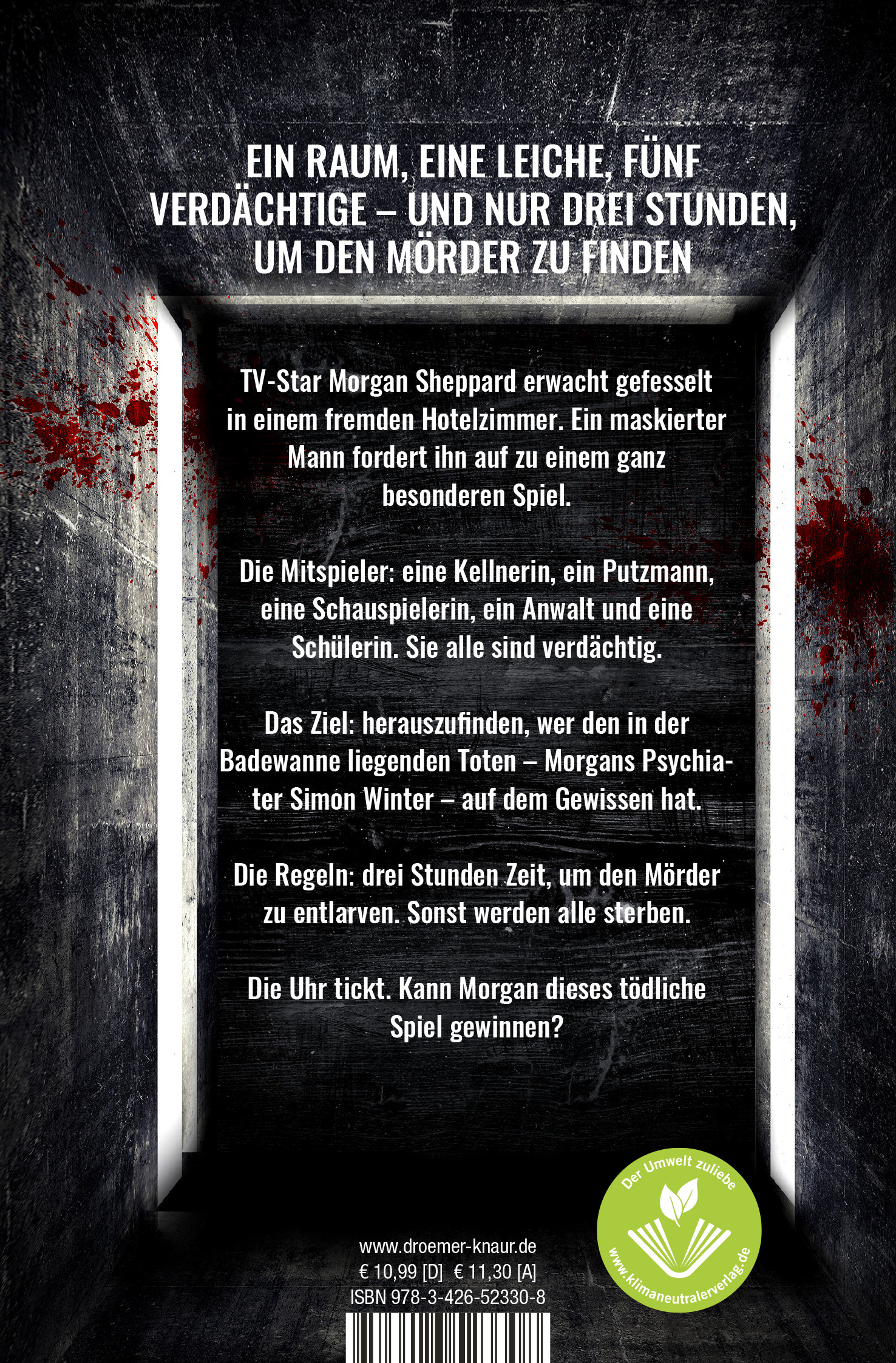Morgan Sheppard, der einst als »Kinder-Detektiv« Berühmtheit erlangte, wacht er in einem ihm unbekannten Hotelzimmer auf, zusammen mit fünf Fremden. Keiner von ihnen weiß, wie er hierher geraten ist. Die Tür ist verriegelt, und im Badezimmer liegt die Leiche von Simon Winter, Morgans langjährigem Psychiater. Über den Fernseher meldet sich ein maskierter Mann: Morgan hat drei Stunden Zeit, unter den Anwesenden Winters Mörder zu enttarnen. Gelingt es Morgan nicht, werden sie alle sterben.