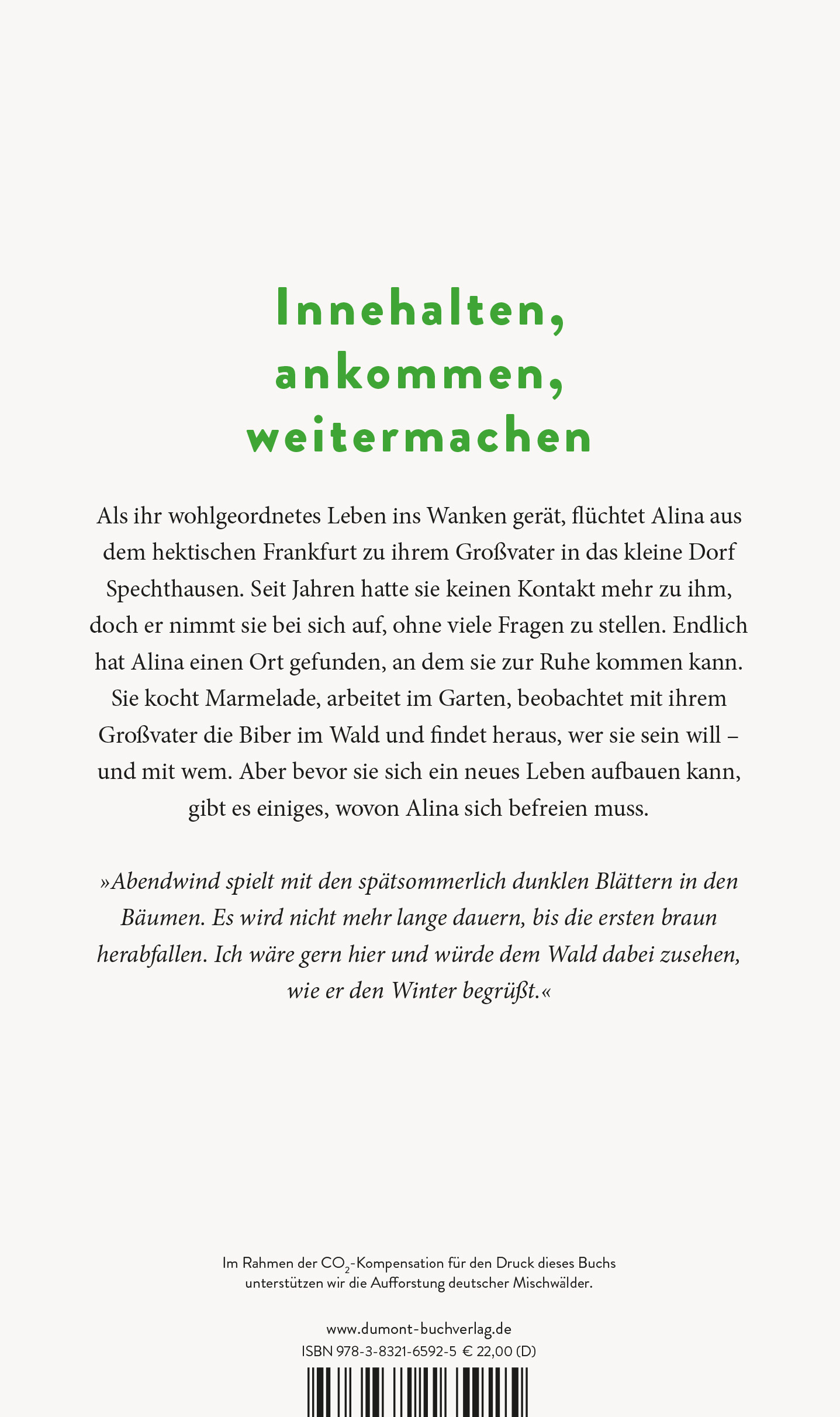 Langsam nähern Alina und er sich wieder an. Sie hilft ihm mit den Hühnern und dem Garten; gemeinsam beobachten sie Biber in freier Wildbahn. Dunkel und fast ein wenig unwirklich sind Alinas Kindheitserinnerungen an die Ferien in Spechthausen. Nun, inmitten der Natur, kehren sie nach und nach zurück. Ehe sie sichs versieht, fühlt sie sich heimisch in dem Ort und den umliegenden Wäldern.