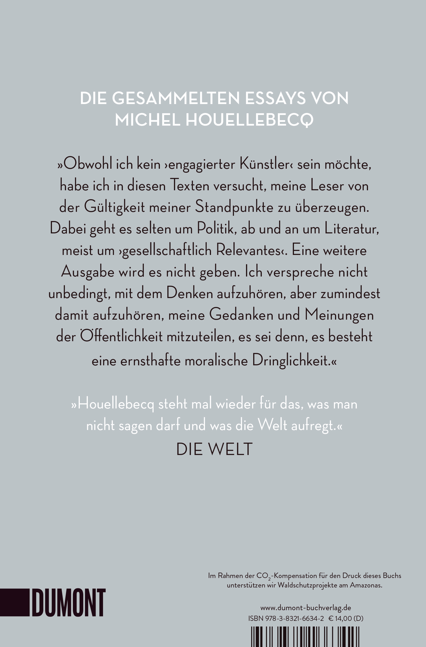 Literatur, Religion, Glaube, Meinungsfreiheit, Konservatismus, Liebe – in seinen Texten beschäftigt sich Michel Houellebecq mit den Themen, die ihn seit jeher bewegen. Und erläutert erneut Positionen, die man von ihm kennt; Positionen, die mal provozieren, mal intellektuell anregen. Dabei geht es auch immer um seine Haltung als Schriftsteller.