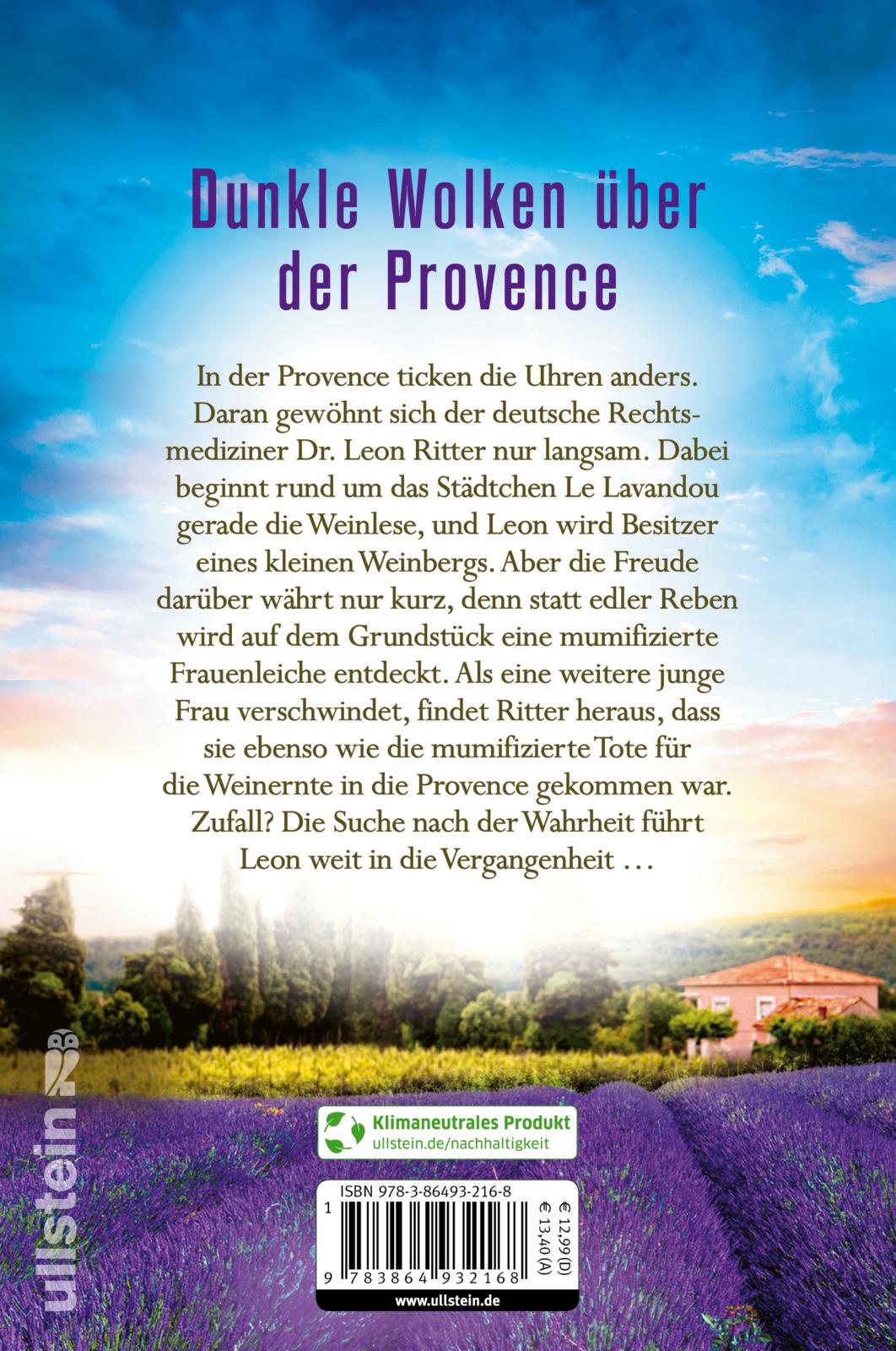 In der Provence ticken die Uhren anders. Daran gewöhnt sich der deutsche Rechtsmediziner Dr. Leon Ritter nur langsam. Dabei beginnt rund um das Städtchen Le Lavandou gerade die Weinlese, und zu seiner eigenen Überraschung wird Ritter Besitzer eines kleinen Weinbergs. Aber die Freude darüber währt nur kurz, denn statt edler Reben wird auf dem Grundstück eine mumifizierte Frauenleiche entdeckt. Der detailversessene Ritter erkennt schnell: Die Tote wurde professionell einbalsamiert. Als eine weitere junge Frau als vermisst gemeldet wird, findet Ritter heraus, dass beide Frauen für die Weinernte in die Provence kamen. Wie hängen die Fälle zusammen? Um Antworten auf seine Fragen zu bekommen, muss Leon weit in die Vergangenheit zurückgehen.