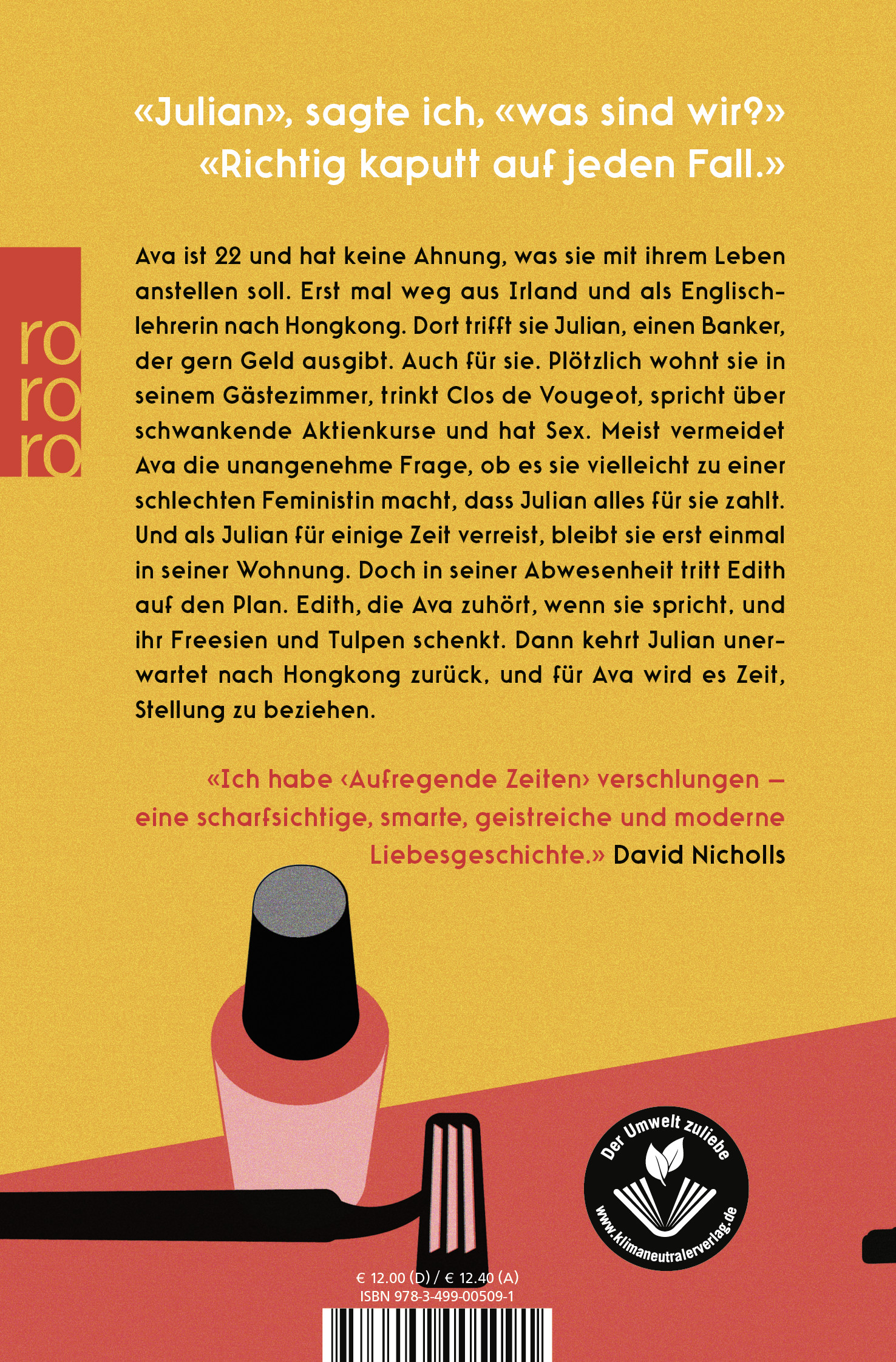 lt;p>Ava ist 22 und hat keine Ahnung, was sie mit ihrem Leben anstellen soll. Erst mal weg aus Irland und als Englischlehrerin nach Hongkong. Dort trifft sie Julian, einen Banker, der gern Geld ausgibt. Plötzlich wohnt sie in seinem Gästezimmer, trinkt Clos Vougeot, spricht über Aktienkurse, hat Sex. Meist vermeidet sie die Frage, ob es sie vielleicht zu einer schlechten Feministin macht, dass er alles für sie zahlt, sogar als er für einige Zeit verreist. In seiner Abwesenheit tritt Edith auf den Plan. Edith, die Ava zuhört, wenn sie spricht, ihr Freesien und Tulpen schenkt. Doch dann kehrt Julian unerwartet nach Hongkong zurück ...
