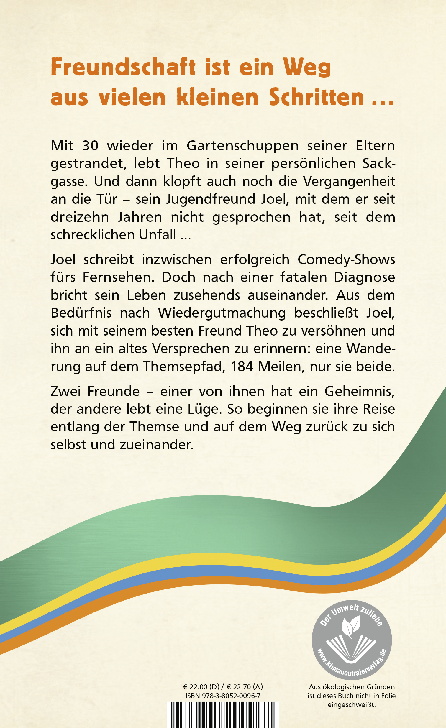 | Schlagworte | Britischer Humor • Bücher aus England • Comedy • Coming-of-age • England • englische Bücher • Englische Popliteratur • Erinnerung • Freunde • Freundschaft • Humor • Jugend • Kindheit • Krankheit • Männerfreundschaft • Nostalgie • Reise • Streit • Themse • Unfall • Unterhaltungsliteratur • Versöhnung • Versprechen • Wandern • Wanderung |