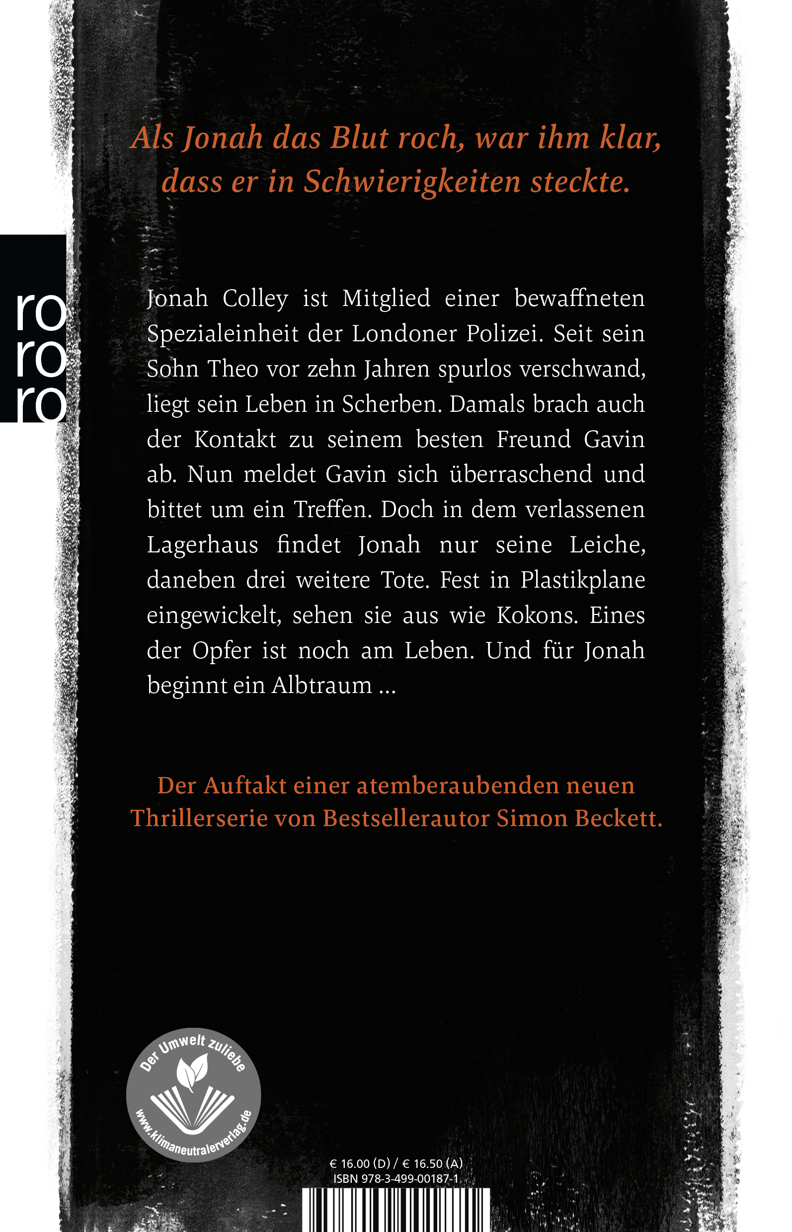 Jonah Colley ist Mitglied einer bewaffneten Spezialeinheit der Londoner Polizei. Seit sein Sohn Theo vor zehn Jahren spurlos verschwand, liegt sein Leben in Scherben. Damals brach auch der Kontakt zu seinem besten Freund Gavin ab. Nun meldet Gavin sich überraschend und bittet um ein Treffen. Doch in dem verlassenen Lagerhaus findet Jonah nur seine Leiche, daneben drei weitere Tote. Fest in Plastikplane eingewickelt, sehen sie aus wie Kokons. Eines der Opfer ist noch am Leben. Und für Jonah beginnt ein Albtraum ...