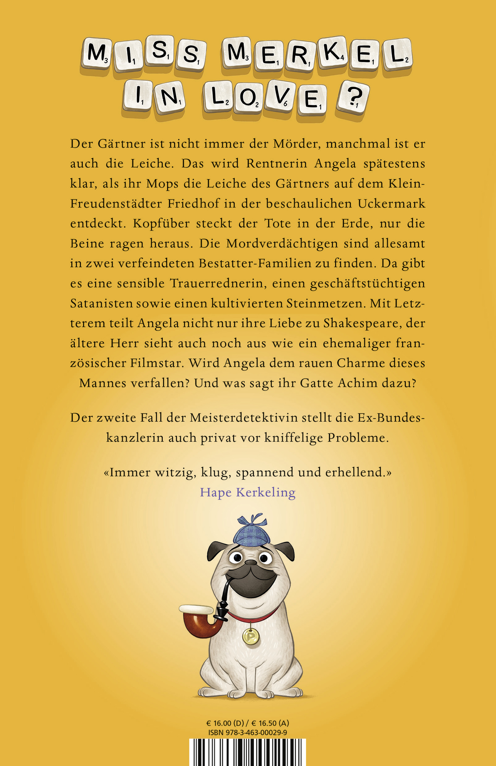 Der Gärtner ist nicht immer der Mörder, manchmal ist er auch die Leiche. Das wird Rentnerin Angela spätestens klar, als ihr Mops die Leiche des Gärtners auf dem Klein-Freudenstädter Friedhof in der beschaulichen Uckermark entdeckt. Kopfüber steckt der Tote in der Erde, nur die Beine ragen heraus. Die Mordverdächtigen sind allesamt in zwei verfeindeten Bestatter-Familien zu finden. Da gibt es einen dubiosen Geschäftsführer, eine spröde Buchhalterin, eine sensible Trauerrednerin, einen Satanisten sowie einen kultivierten Steinmetz. Mit letzterem teilt Angela nicht nur ihre Liebe zu Shakespeare, der ältere Herr sieht auch noch aus wie ein ehemaliger französischer Filmstar. Wird Angela dem rauen Charme dieses Mannes verfallen? Und was sagt ihr Gatte Achim dazu? Der zweite Fall der Meisterdetektivin Miss Merkel stellt die Ex-Bundeskanzlerin auch privat vor kniffelige Probleme.