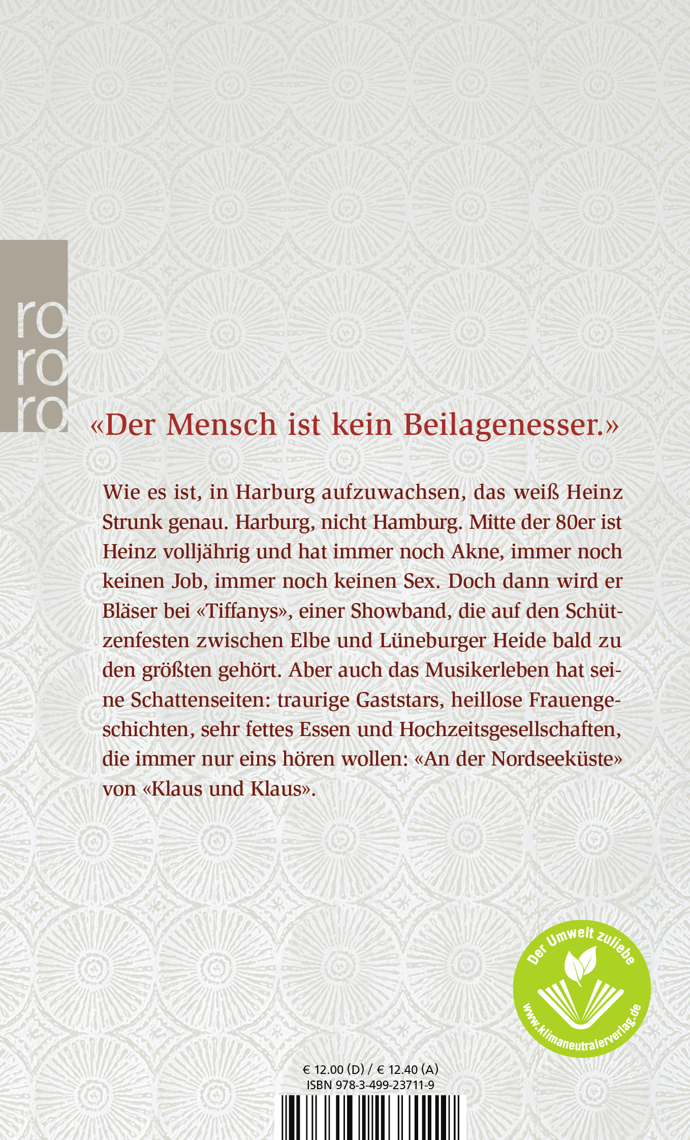 Wie es ist, in Harburg aufzuwachsen, das weiß Heinz Strunk genau. Harburg, nicht Hamburg. Mitte der 80er ist Heinz volljährig und hat immer noch Akne, immer noch keinen Job, immer noch keinen Sex. Doch dann wird er Bläser bei Tiffanys, einer Showband, die auf den Schützenfesten zwischen Elbe und Lüneburger Heide bald zu den größten gehört. Aber auch das Musikerleben hat seine Schattenseiten: traurige Gaststars, heillose Frauengeschichten, sehr fettes Essen und Hochzeitsgesellschaften, die immer nur eins hören wollen: "An der Nordseeküste" von Klaus und Klaus.