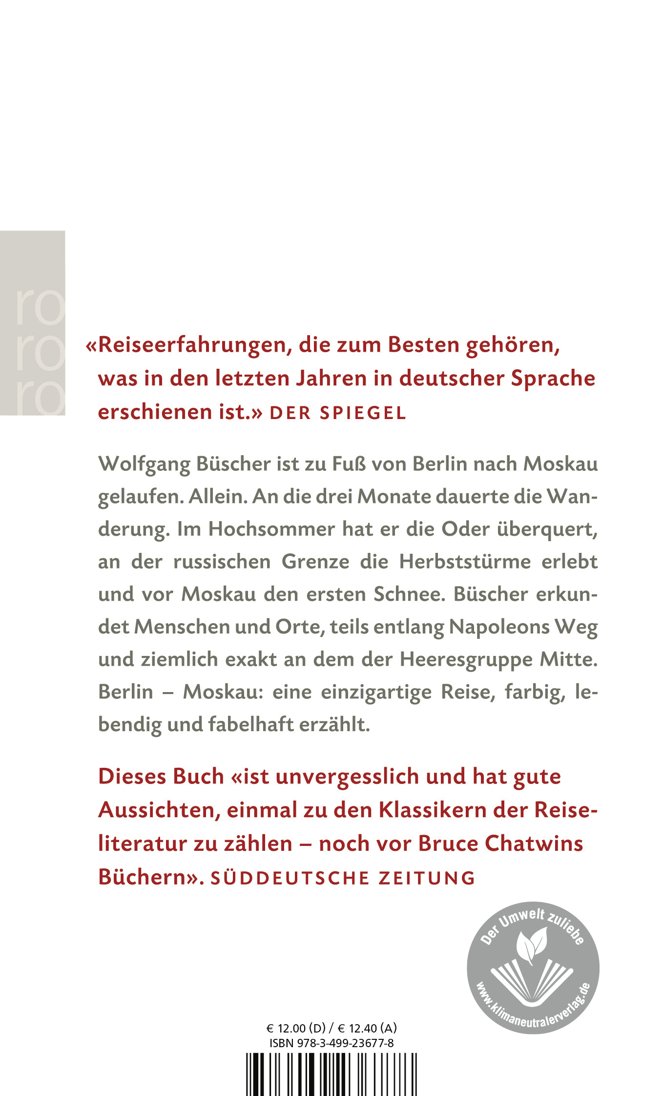 Wolfgang Büscher ist zu Fuß von Berlin nach Moskau gelaufen. Allein. An die drei Monate dauerte die Wanderung. Im Hochsommer hat er die Oder überquert, an der russischen Grenze die Herbststürme erlebt und vor Moskau den ersten Schnee. Büscher erkundet Menschen und Orte, teils entlang Napoleons Weg und ziemlich exakt an dem der Heeresgruppe Mitte. Berlin - Moskau: eine einzigartige Reise, farbig, lebendig und fabelhaft erzählt.