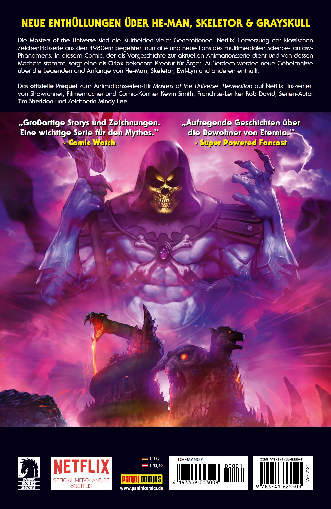 NEUE ENTHÜLLUNGEN ÜBER HE-MAN, SKELETOR & GRAYSKULL Die Masters of the Universe sind die Kulthelden vieler Generationen. Netflix' Fortsetzung der klassischen Zeichentrickserie aus den 1980ern begeistert nun alte und neue Fans des multimedialen Science-Fantasy- Phänomens. In diesem Comic, der als Vorgeschichte zur aktuellen Animationsserie dient und von dessen Machern stammt, sorgt eine als Orlax bekannte Kreatur für Ärger. Außerdem werden neue Geheimnisse über die Legenden und Anfänge von He-Man, Skeletor, Evil-Lyn und anderen enthüllt. Das offizielle Prequel zum Animationsserien-Hit Masters of the Universe: Revelation auf Netflix, inszeniert von Showrunner, Filmemacher und Comic-Könner Kevin Smith, Franchise-Lenker Rob David, Serien-Autor Tim Sheridan und Zeichnerin Mindy Lee.