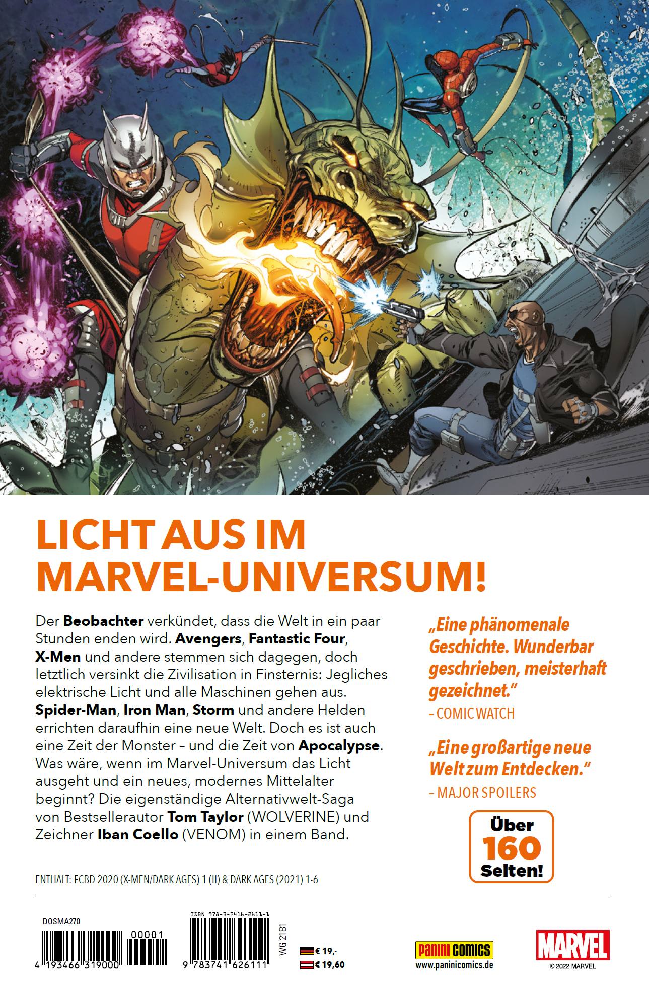 LICHT AUS IM MARVEL-UNIVERSUM! Der Beobachter verkündet, dass die Welt in ein paar Stunden enden wird. Avengers, Fantastic Four, X-Men und andere stemmen sich dagegen, doch letztlich versinkt die Zivilisation in Finsternis: Jegliches elektrische Licht und alle Maschinen gehen aus. Spider-Man, Iron Man, Storm und andere Helden errichten daraufhin eine neue Welt. Doch es ist auch eine Zeit der Monster - und die Zeit von Apocalypse. Was wäre, wenn im Marvel-Universum das Licht ausgeht und ein neues, modernes Mittelalter beginnt? Die eigenständige Alternativwelt-Saga von Bestsellerautor Tom Taylor (WOLVERINE) und Zeichner Iban Coello (VENOM) in einem Band. ENTHÄLT: FCBD 2020 (X-MEN/DARK AGES) 1 (II) & DARK AGES (2021) 1-6