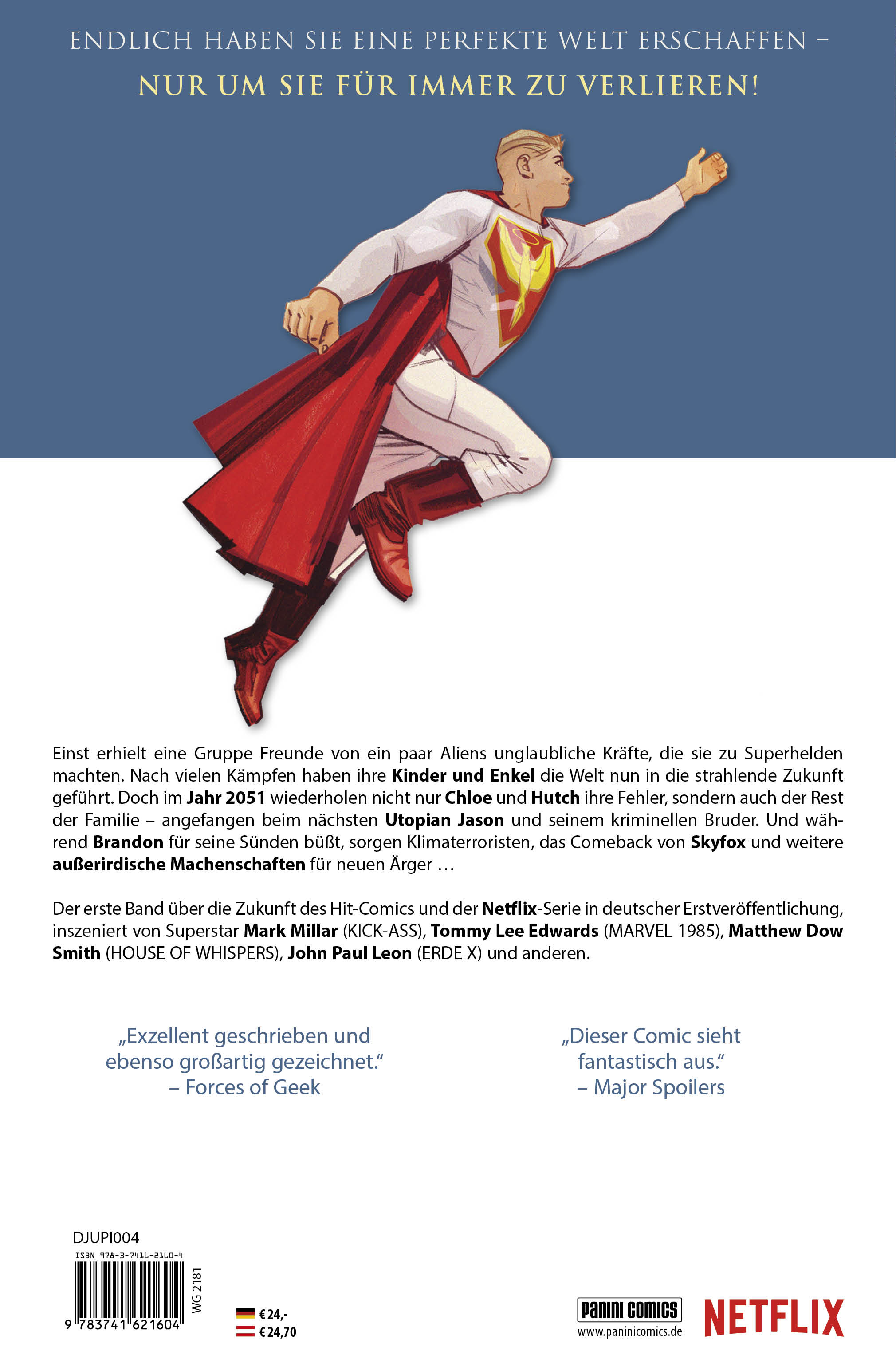ENDLICH HABEN SIE EINE PERFEKTE WELT ERSCHAFFEN - NUR UM SIE FÜR IMMER ZU VERLIEREN!Einst erhielt eine Gruppe Freund von ein paar Aliens unglaubliche Kräfte, die sie zu Superhelden machten. Nach vielen Kämpfen haben ihre Kinder und Enkel die Welt nun in die strahlende Zukunft geführt. Doch im Jahr 2051 wiederholen nicht nur Chloe und Hutch ihre Fehler, sondern auch der Rest der Familie - angefangen beim nächsten Utopian Jason und seinem kriminellen Bruder. Und während Brandon für seine Sünden büßt, sorgen Klimaterroristen, das Comeback von Skyfox und weitere außerirdische Machenschaften für neuen Ärger ...Der erste Band über die Zukunft des Hit-Comics und der Netflix-Serie in deutscher Erstveröffentlichung, inszeniert von Superstar Mark Millar (KICK-ASS), Tommy Lee Edwards (MARVEL 1985), Matthew Dow Smith (HOUSE OF WHISPERS), John Paul Leon (ERDE X) und anderen.