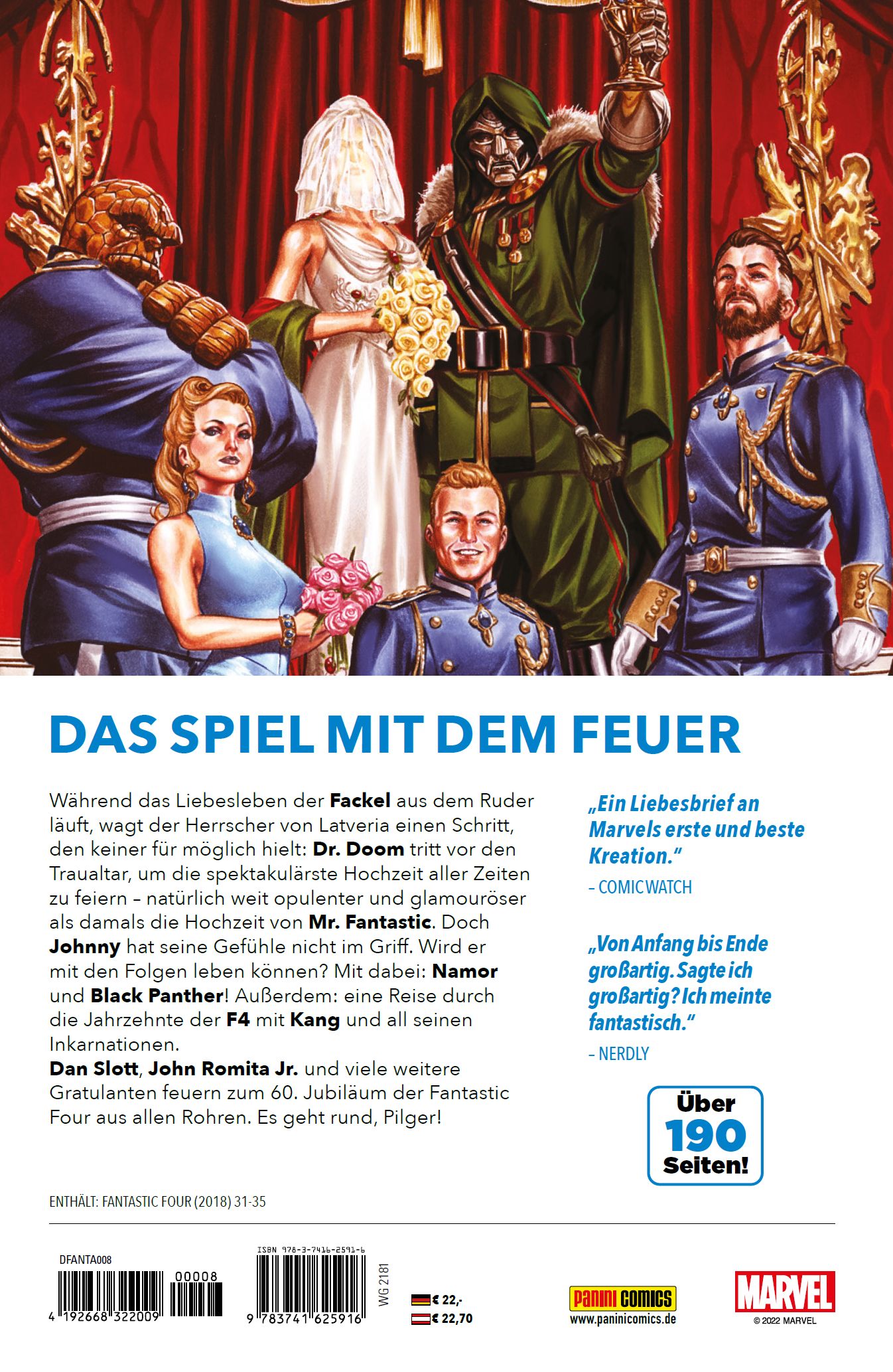 DAS SPIEL MIT DEM FEUER Während das Liebesleben der Fackel aus dem Ruder läuft, wagt der Herrscher von Latveria einen Schritt, den keiner für möglich hielt: Dr. Doom tritt vor den Traualtar, um die spektakulärste Hochzeit aller Zeiten zu feiern - natürlich weit opulenter und glamouröser als damals die Hochzeit von Mr. Fantastic. Doch Johnny hat seine Gefühle nicht im Griff. Wird er mit den Folgen leben können? Mit dabei: Namor und Black Panther! Außerdem: eine Reise durch die Jahrzehnte der F4 mit Kang und all seinen Inkarnationen. Dan Slott, John Romita Jr. und viele weitere Gratulanten feuern zum 60. Jubiläum der Fantastic Four aus allen Rohren. Es geht rund, Pilger!ENTHÄLT: FANTASTIC FOUR (2018) 31-35