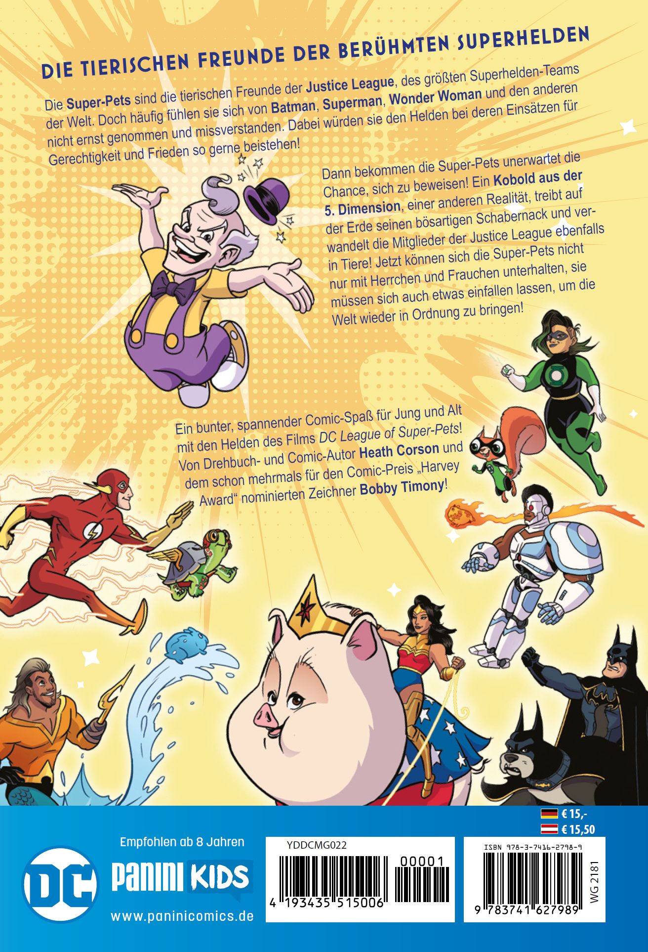 DIE TIERISCHEN FREUNDE DER BERÜHMTEN SUPERHELDENDie Super-Pets sind die tierischen Freunde der Justice League, dem größten Superhelden-Team der Welt. Doch häufig fühlen sie sich von Batman, Superman, Wonder Woman und den anderen nicht ernst genommen und missverstanden. Dabei würden sie den Helden in deren Einsätzen für Gerechtigkeit und Frieden so gerne beistehen!Dann bekommen die Super-Pets unerwartet die Chance, sich zu beweisen! Ein Kobold aus der 5. Dimension, einer anderen Realität, treibt auf der Erde seinen bösartigen Schabernack und verwandelt die Mitglieder der Justice League ebenfalls in Tiere! Jetzt können sich die Super-Pets nicht nur mit Herrchen und Frauchen unterhalten, sie müssen sich auch etwas einfallen lassen, um die Welt wieder in Ordnung zu bringen!Ein bunter, spannender Comic-Spaß für Jung und Alt mit den Helden des Films DC League of Super-Pets! Von Drehbuch- und Comic-Autor Heath Corson und dem schon mehrmals für den Comic-Preis Harvey Award nominierten Zeichner Bobby Timony!