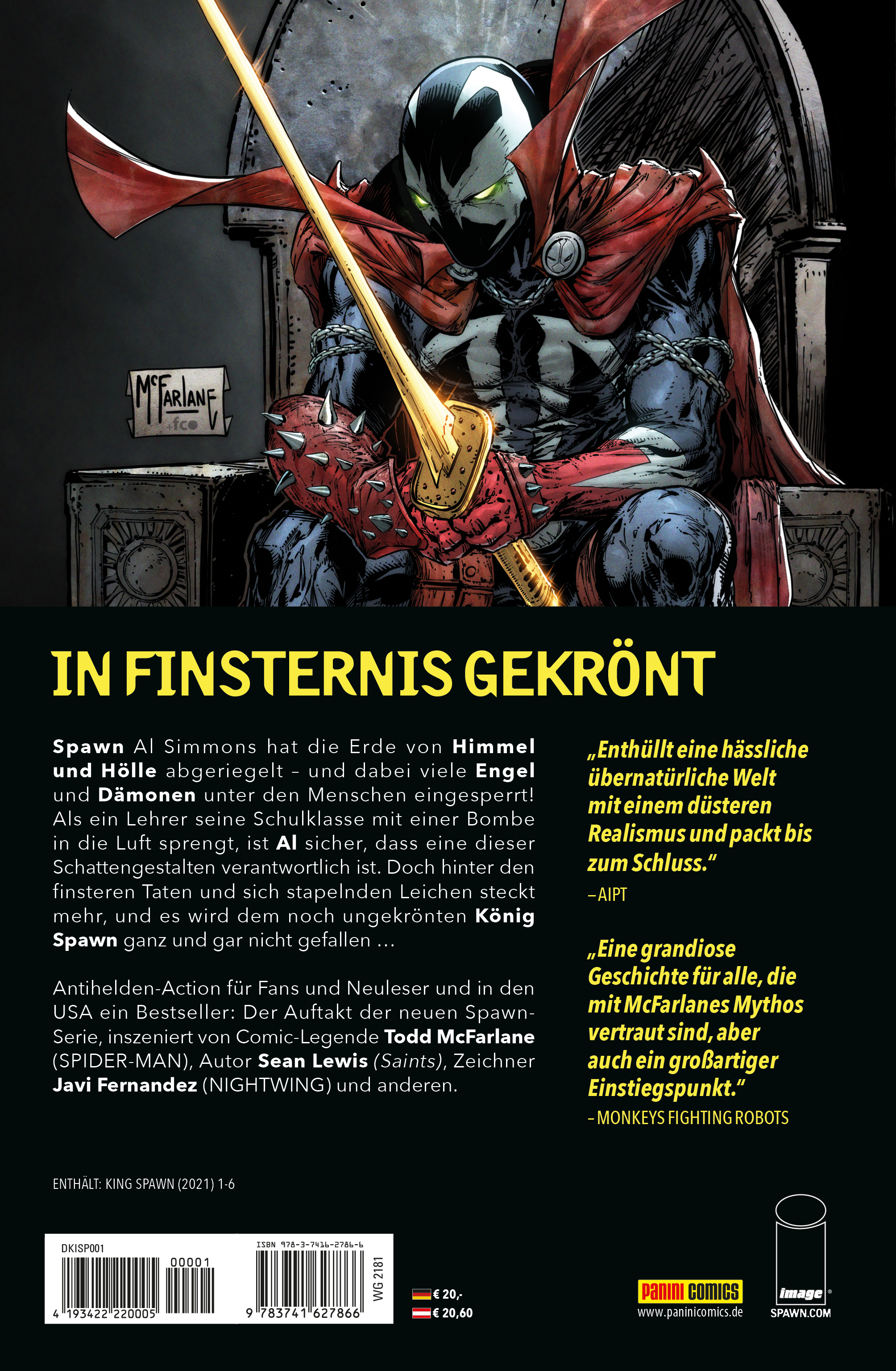 IN FINSTERNIS GEKRÖNTSpawn Al Simmons hat die Erde von Himmel und Hölle abgeriegelt - und dabei viele Engel und Dämonen unter den Menschen eingesperrt! Als ein Lehrer seine Schulklasse mit einer Bombe in die Luft sprengt, ist Al sicher, dass einer dieser Schattengestalten dafür verantwortlich ist. Doch hinter den finstern Taten uns ich stapelnden Leichen steckt mehr, und es wir dem noch ungekrönten König Spawn ganz und gar nicht gefallen ...Antihelden-Action für Fans und Neuleser und in den USA ein Bestseller: Der Auftakt der neuen Spawn-Serie, inszeniert von Comic-Legende Todd McFarlane (SPIDER-MAN), Autor Sean Lewis (Saints), Zeichner Javi Fernandez (NICHTWING) und anderen.Enthält: King Spawn (2021) 1-6