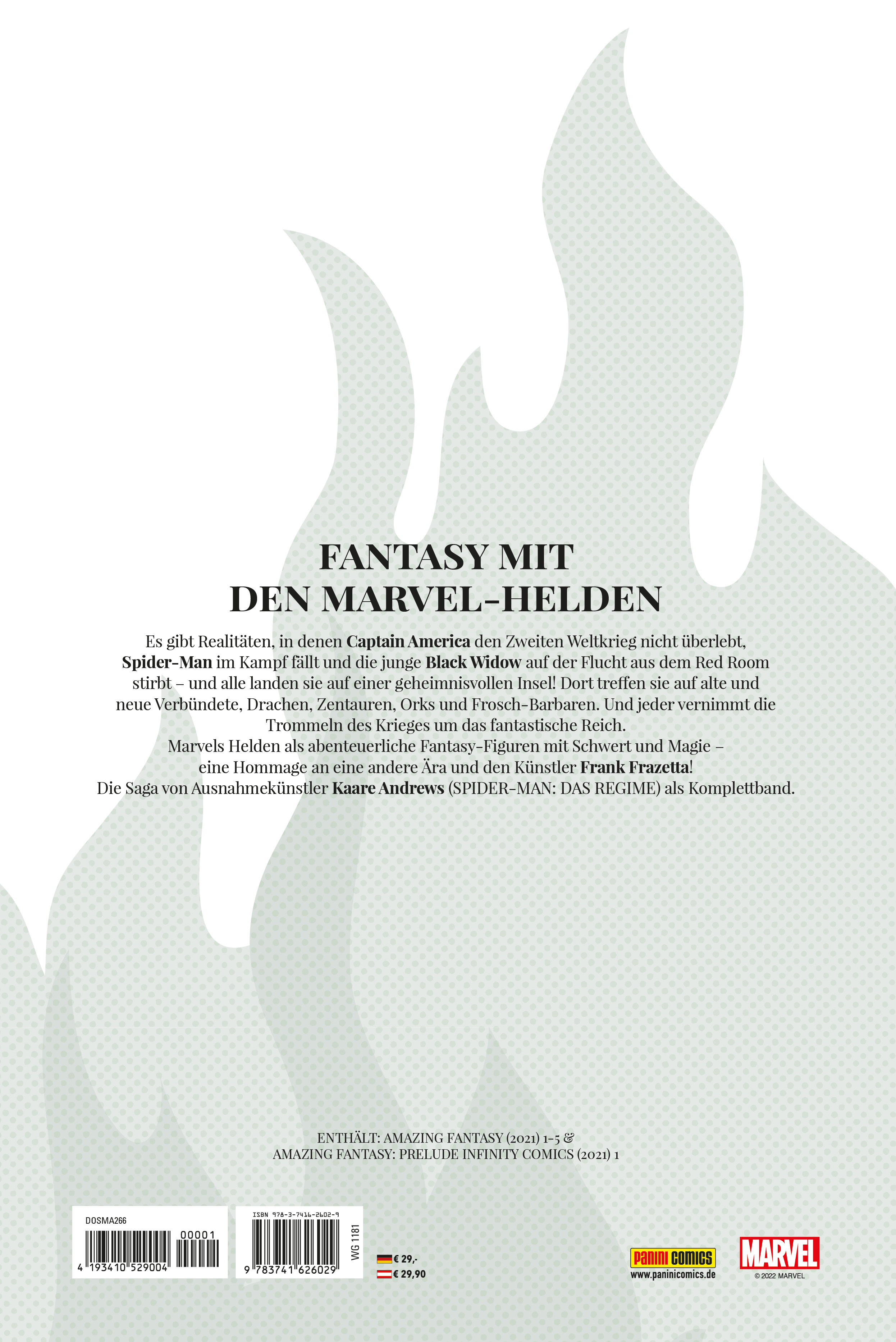 FANTASY MIT DEN MARVEL-HELDENEs gibt Realitäten, in den Captain America den Zweiten Weltkrieg nicht überlebt, Spider-Man im Kampf fällt und die junge Black Widow auf der Flucht aus dem Red Room stirbt - und alle landen sie auf einer geheimnisvollen Insel! Dort treffen sie auf alte und neue Verbündete, Drachen, Zentauren, Orks und Frosch-Barbaren. Und jeder vernimmt die Trommeln des Krieges um das fantastische Reich.Marvels Helden als abenteuerliche Fantasy-Figuren mit Schwert und Magie - eine Hommage an eine andere Ära und den Künstler Frank Frazetta!Die Saga von Ausnahmekünsterl Kaare Andrews (SPIDER-MAN: DAS REGIME) als Komplettband.ENTHÄLT: Amazing Fantasy (2021) 1-5 & Amazing Fantasy: Prelude Infinity Comics (2021) 1