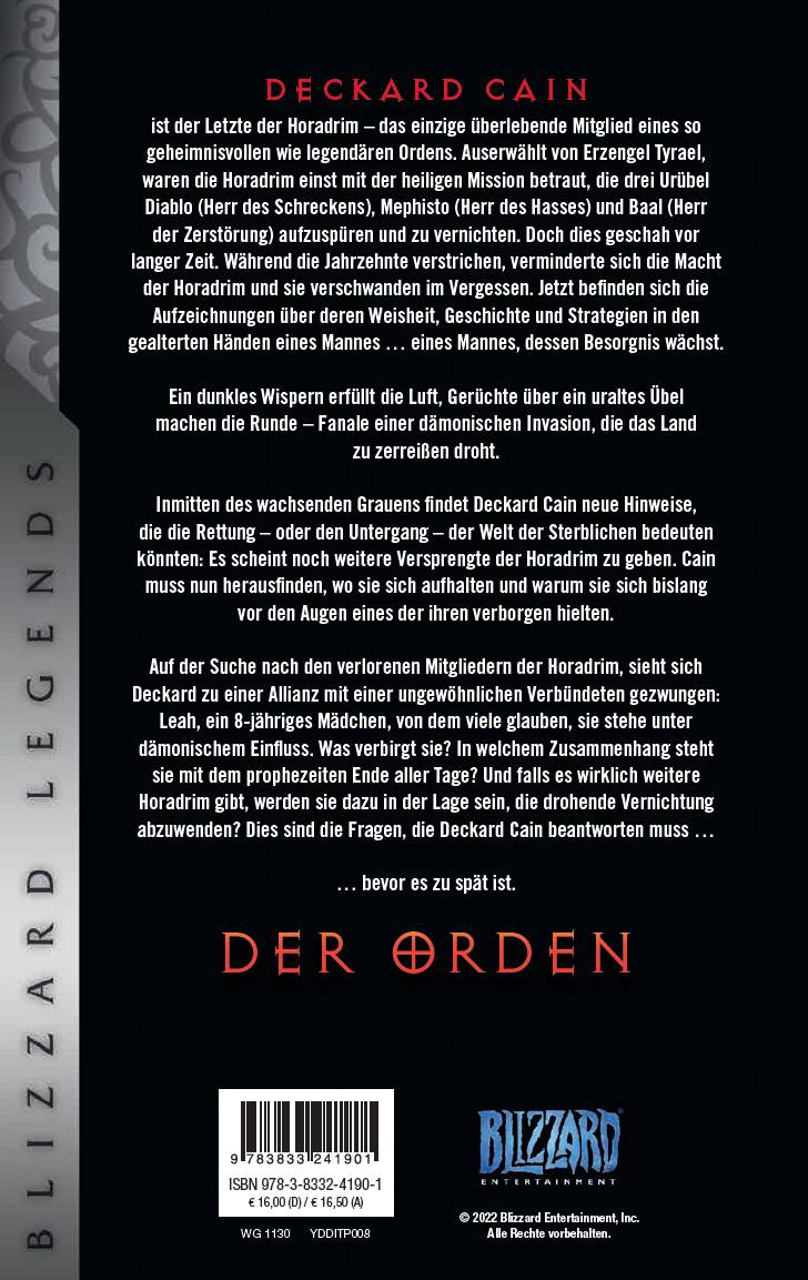 DECKARD CAIN ist der Letzte der Horadrim - das einzige überlebende Mitglied eines so geheimnisvollen wie legendären Ordens. Auserwählt von Erzengel Tyrael, waren die Horadrim einst mit der heiligen Mission betraut, die drei Urübel Diablo (Herr des Schreckens), Mephisto (Herr des Hasses) und Baal (Herr der Zerstörung) aufzuspüren und zu vernichten. Doch dies geschah vor langer Zeit. Während die Jahrzehnte verstrichen, verminderte sich die Macht der Horadrim und sie verschwanden im Vergessen. Jetzt befinden sich die Aufzeichnungen über deren Weisheit, Geschichte und Strategien in den gealterten Händen eines Mannes ... eines Mannes, dessen Besorgnis wächst. Ein dunkles Wispern erfüllt die Luft, Gerüchte über ein uraltes Übel machen die Runde - Fanale einer dämonischen Invasion, die das Land zu zerreißen droht. Inmitten des wachsenden Grauens findet Deckard Cain neue Hinweise, die die Rettung - oder den Untergang - der Welt der Sterblichen bedeuten könnten: Es scheint noch weitere Versprengte der Horadrim zu geben. Cain muss nun herausfinden, wo sie sich aufhalten und warum sie sich bislang vor den Augen eines der ihren verborgen hielten. Auf der Suche nach den verlorenen Mitgliedern der Horadrim, sieht sich Deckard zu einer Allianz mit einer ungewöhnlichen Verbündeten gezwungen: Leah, ein 8-jähriges Mädchen, von dem viele glauben, sie stehe unter dämonischem Einfluss. Was verbirgt sie? In welchem Zusammenhang steht sie mit dem prophezeiten Ende aller Tage? Und falls es wirklich weitere Horadrim gibt, werden sie dazu in der Lage sein, die drohende Vernichtung abzuwenden? Dies sind die Fragen, die Deckard Cain beantworten muss ... ... bevor es zu spät ist.