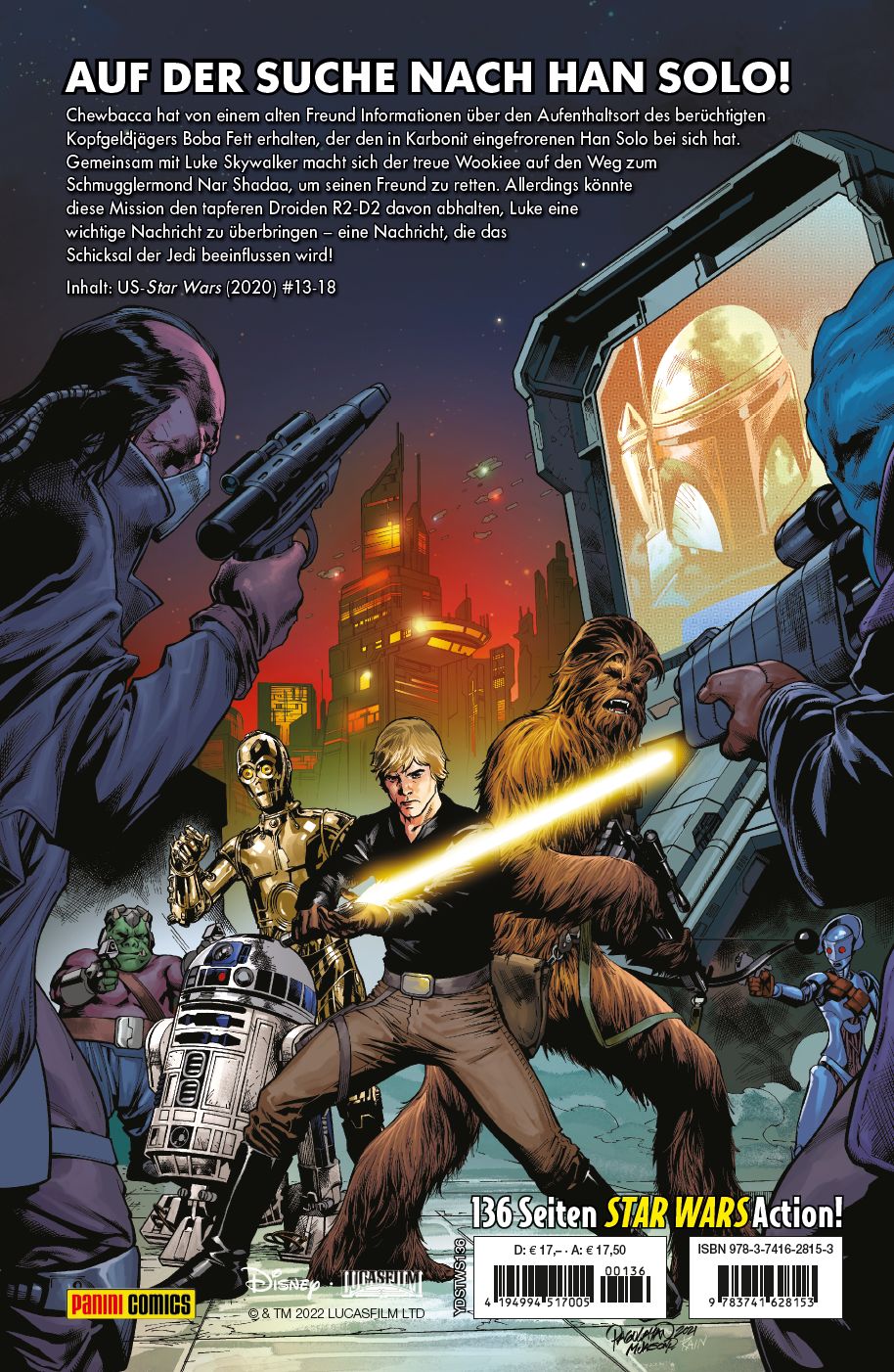 AUF DER SUCHE NACH HAN SOLO! Chewbacca hat von einem alten Freund Informationen über den Aufenthaltsort des berüchtigten Kopfgeldjägers Boba Fett erhalten, der den in Karbonit eingefrorenen Han Solo bei sich hat. Gemeinsam mit Luke Skywalker macht sich der treue Wookiee auf den Weg zum Schmugglermond Nar Shadaa, um seinen Freund zu retten. Allerdings könnte diese Mission den tapferen Droiden R2-D2 davon abhalten, Luke eine wichtige Nachricht zu überbringen - eine Nachricht, die das Schicksal der Jedi beeinflflussen wird! Inhalt: US-Star Wars (2020) #13-18