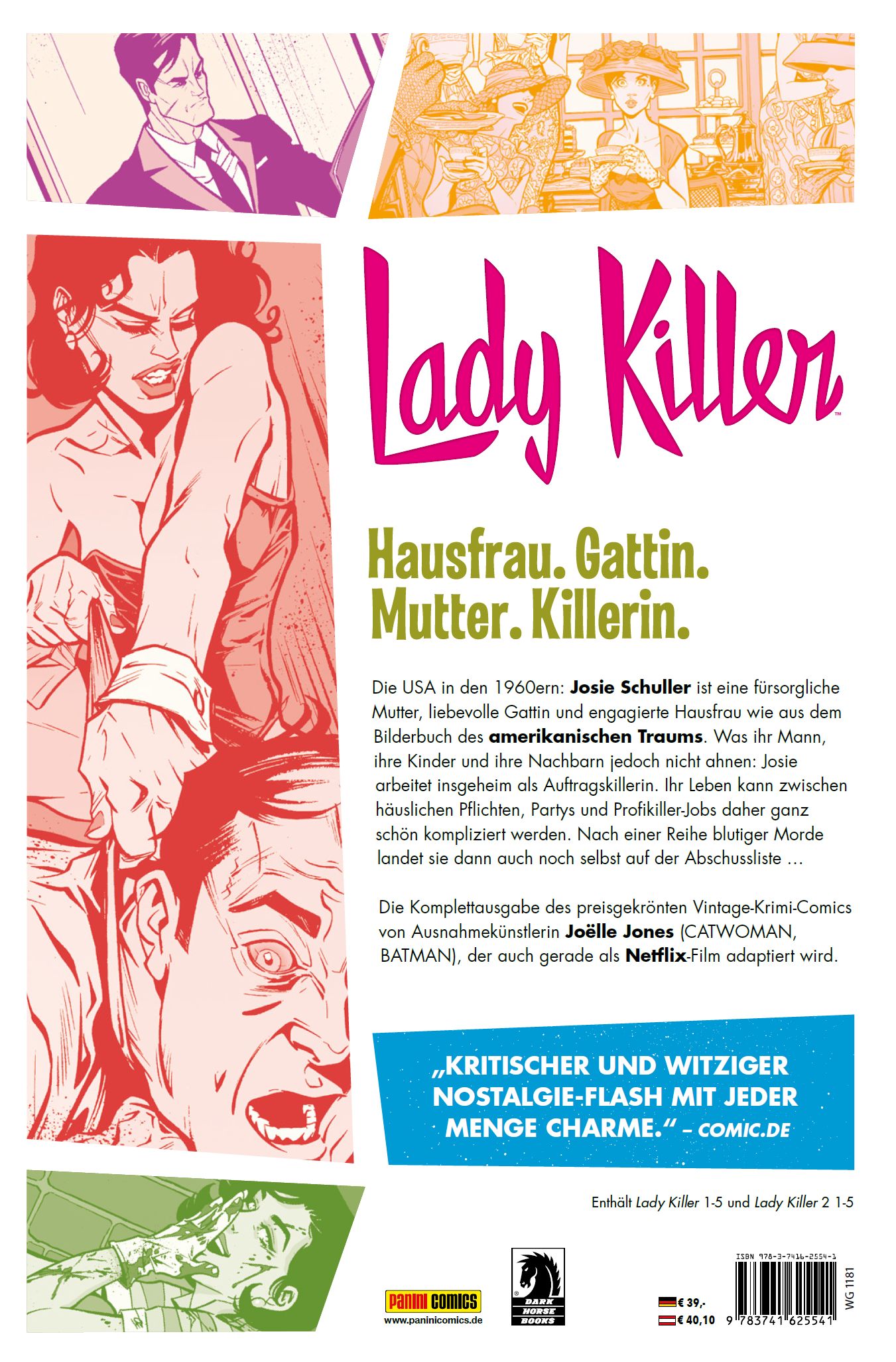 Hausfrau. Gattin. Mutter. Killerin.Die USA in den 1960ern: Josie Schuller ist eine fürsorgliche Mutter, liebevolle Gattin und engagierte Hausfrau wie aus dem Bilderbuch des amerikanischen Traums. Was ihr Mann, ihre Kinder und ihre Nachbarn jedoch nicht ahnen: Josie arbeitet insgeheim als Auftragskillerin. Ihr Leben kann zwischen häuslichen Pflichten, Partys und Profikiller-Jobs daher ganz schön kompliziert werden. Nach einer Reihe blutiger Morde landet sie dann auch noch selbst auf der Abschussliste ... Die Komplettausgabe des preisgekrönten Vintage-Krimi-Comics von Ausnahmekünstlerin Joelle Jones (CATWOMAN, BATMAN), der auch gerade als Netflix-Film adaptiert wird.Enthält Lady Killer 1-5 und Lady Killer 2 1-5