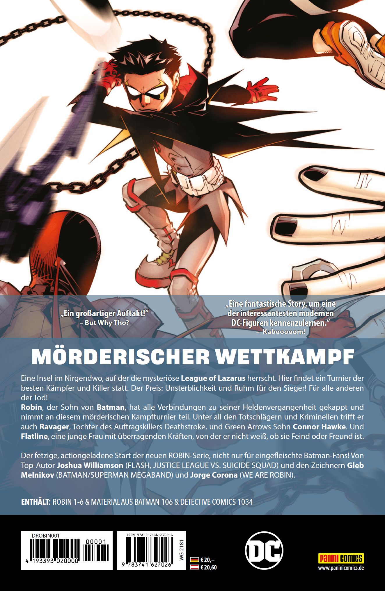 MÖRDERISCHER WETTKAMPFEine Insel im Nirgendwo, auf der die mysteriöse League of Lazarus herrscht! Hier findet ein Turnier der besten Kämpfer und Killer statt! Der Preis: Unsterblichkeit und Ruhm für den Sieger! Für alle anderen der Tod!Robin, der Sohn von Batman, hat alle Verbindungen zu seiner Heldenvergangenheit gekappt und nimmt an diesem mörderischen Kampfturnier teil. Unter all den Totschlägern und Kriminellen trifft er auch Ravager, Tochter des Auftragskillers Deathstroke, und Green Arrows Sohn Connor Hawke! Und Flatline, eine junge Frau mit überragenden Kräften, von der er nicht weiß, ob sie Feind oder Freund ist! Der fetzige, action-geladene Start der neuen ROBIN-Serie, nicht nur für eingefleischte Batman-Fans! Von Top-Autor Joshua Williamson (FLASH, JUSTICE LEAGUE VS. SUICIDE SQUAD) und den Zeichnern Gleb Melnikov (BATMAN/SUPERMAN MEGABAND) und Jorge Corona (WE ARE ROBIN).ENTHÄLT: ROBIN 1-6 & MATERIAL AUS BATMAN