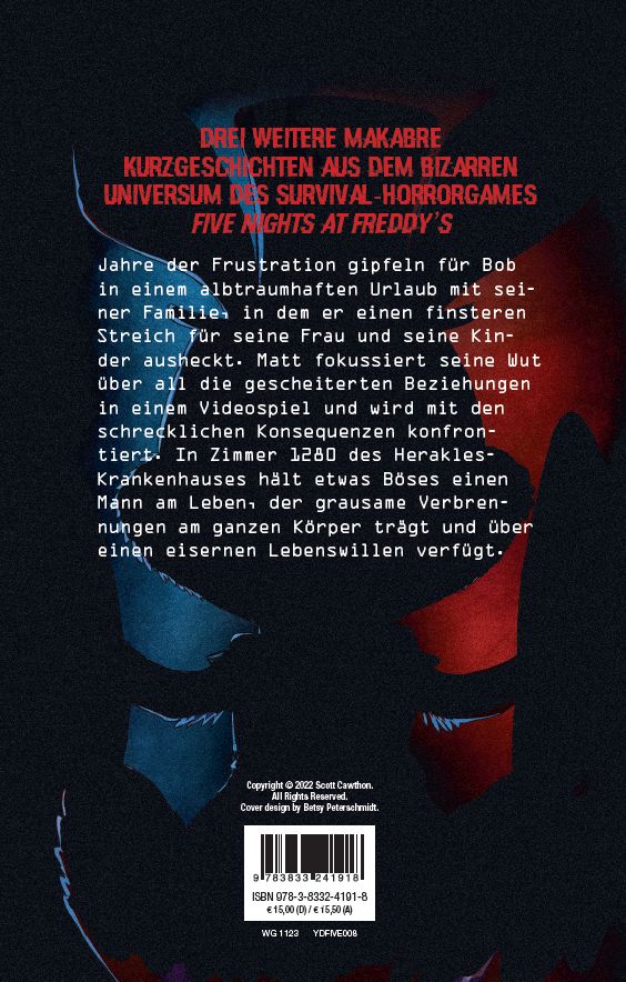 DREI WEITERE MAKABRE KURZGESCHICHTEN AUS DEM BIZARREN UNIVERSUM DES SURVIVAL-HORRORGAMES FIVE NIGHTS AT FREDDY'S Jahre der Frustration gipfeln für Bob in einem albtraumhaften Urlaub mit seiner Familie, in dem er einen finsteren Streich für seine Frau und seine Kinder ausheckt. Matt fokussiert seine Wut über all die gescheiterten Beziehungen in einem Videospiel und wird mit den schrecklichen Konsequenzen konfrontiert. In Zimmer 1280 des Herakles- Krankenhauses hält etwas Böses einen Mann am Leben, der grausame Verbrennungen am ganzen Körper trägt und über einen eisernen Lebenswillen verfügt.