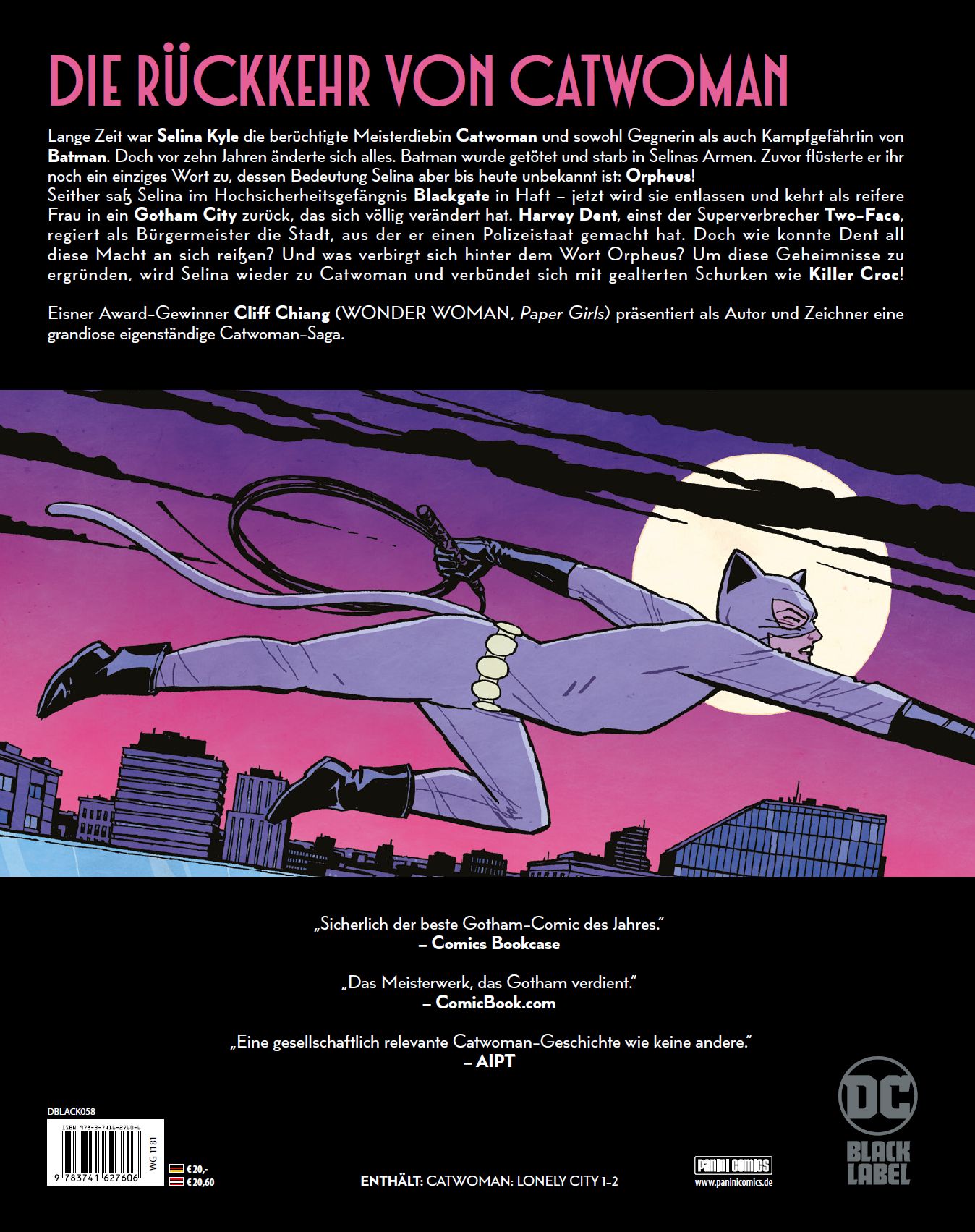 DIE RÜCKKEHR VON CATWOMANLange Zeit war Selina Kyle die berüchtigte Meisterdiebin Catwoman und sowohl Gegnerin als auch Kampfgefährtin von Batman. Doch vor zehn Jahren änderte sich alles. Batman wurde getötet und starb in Selinas Armen. Zuvor flüsterte er ihr noch ein einziges Wort zu, dessen Bedeutung Selina aber bis heute unbekannt ist: Orpheus! Seither saß Selina im Hochsicherheitsgefängnis Blackgate in Haft - jetzt wird sie entlassen und kehrt als gealterte Frau in ein Gotham City zurück, das sich völlig verändert hat. Harvey Dent, einst der Superverbrecher Two-Face, regiert als Bürgermeister die Stadt, aus der er einen Polizeistaat gemacht hat. Doch wie konnte Dent all diese Macht an sich reißen? Und was verbirgt sich hinter dem Wort Orpheus? Um diese Geheimnisse zu ergründen, wird Selina wieder zu Catwoman und verbündet sich mit gealterten Schurken wie Killer Croc! Eisner Award-Gewinner Cliff Chiang (WONDER WOMAN, Paper Girls) präsentiert als Autor und Zeichner eine grandiose eigenständige Catwoman-Saga.ENTHÄLT: CATWOMAN: LONELY CITY 1-2