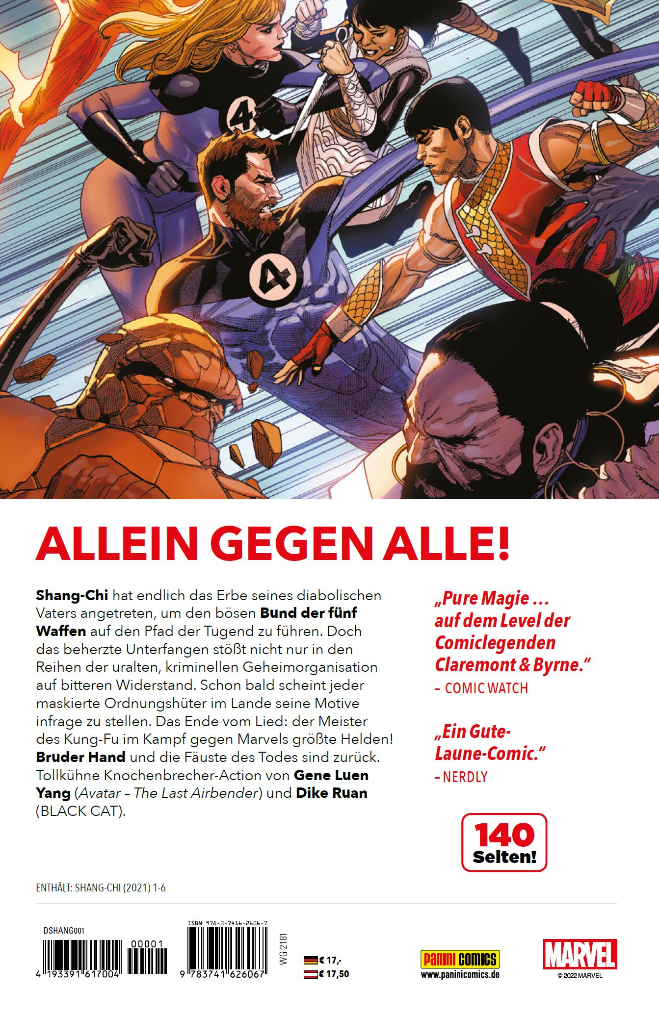 ALLEIN GEGEN ALLE!Shang-Chi hat endlich das Erbe seines diabolischen Vaters angetreten, um den infamen Bund der fünf Waffen auf den Pfad der Tugend zu führen. Doch das beherzte Unterfangen stößt nicht nur in den Reihen der uralten, kriminellen Geheimorganisation auf bitteren Widerstand. Schon bald scheint jeder maskierte Ordnungshüter im Lande seine Motive infrage zu stellen. Das Ende vom Lied: der Meister des Kung-Fu im Kampf gegen Marvels größte Helden! Bruder Hand und die Fäuste des Todes sind zurück. Tollkühne Knochenbrecher-Action von Gene Luen Yang (Avatar - The Last Airbender) und Dike Ruan (BLACK CAT). ENTHÄLT: SHANG-CHI (2021) 1-6
