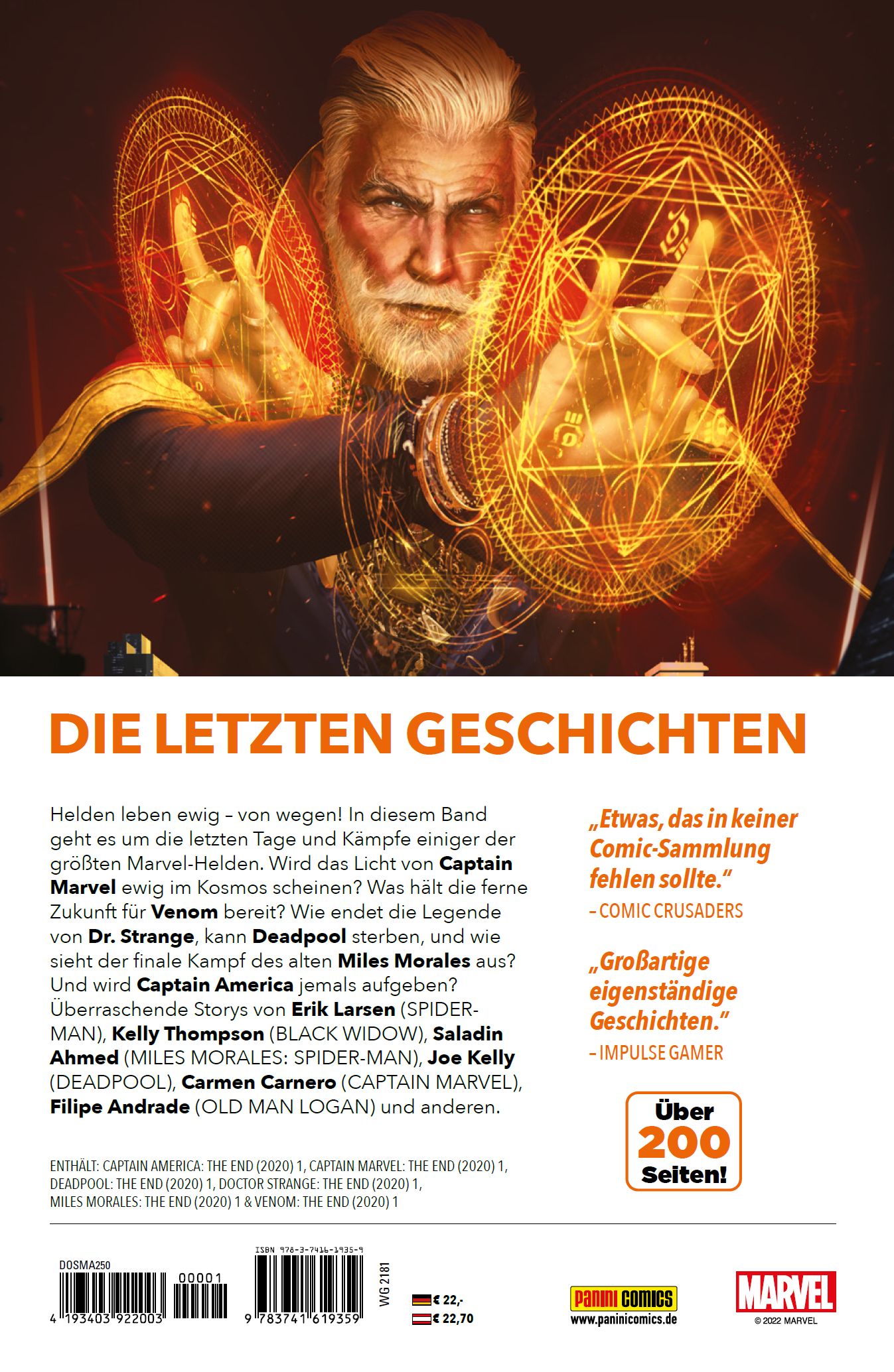 DIE LETZTEN GESCHICHTENHelden leben ewig - von wegen! In diesem Band geht es um die letzten Tage und Kämpfe einiger der größten Marvel-Helden. Wird das Licht von Captain Marvel ewig im Kosmos scheinen? Was hält die ferne Zukunft für Venom bereit? Wie endet die Legende von Dr. Strange, kann Deadpool sterben und wie sieht der finale Kampf des alten Miles Morales aus? Und wird Captain America jemals aufgeben? Überraschende Storys von Erik Larsen (SPIDER-MAN), Kelly Thompson (BLACK WIDOW), Saladin Ahmed (MILES MORALES: SPIDER-MAN), Joe Kelly (DEADPOOL), Carmen Carnero (CAPTAIN MARVEL), Filipe Andrade (OLD MAN LOGAN) und anderen. ENTHÄLT: CAPTAIN AMERICA: THE END (2020) 1, CAPTAIN MARVEL: THE END (2020) 1, DEADPOOL: THE END (2020) 1, DOCTOR STRANGE: THE END (2020) 1, MILES MORALES: THE END (2020) 1 & VENOM: THE END (2020) 1