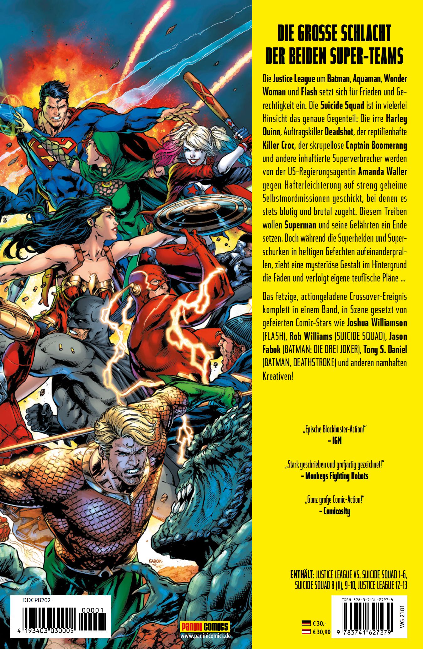 DIE GROSSE SCHLACHT DER BEIDEN SUPER-TEAMSDie Justice League um Batman, Aquaman, Wonder Woman und Flash setzt sich ein für Frieden und Gerechtigkeit. Die Suicide Squad ist in vielerlei Hinsicht das genaue Gegenteil: Die irre Harley Quinn, Auftragskiller Deadshot, der reptilienhafte Killer Croc, der skrupellose Captain Boomerang und andere inhaftierte Superverbrecher werden von der US-Regierungsagentin Amanda Waller gegen Hafterleichterung auf streng geheime Selbstmordmissionen geschickt, bei denen es stets blutig und brutal zugeht. Diesem Treiben wollen Superman und seine Gefährten ein Ende setzen. Doch während die Superhelden und Superschurken in heftigen Gefechten aufeinanderprallen, zieht eine mysteriöse Gestalt im Hintergrund die Fäden und verfolgt eigene teuflische Pläne ...Das fetzige, actiongeladene Crossover-Ereignis komplett in einem Band, in Szene gesetzt von gefeierten Comic-Stars wie Joshua Williamson (FLASH), Rob Williams (SUICIDE SQUAD), Jason Fabok (BATMAN: DIE DREI JOKER), Tony S. Daniel (BATMAN, DEATHSTROKE) und anderen namhaften Kreativen!ENTHÄLT: JUSTICE LEAGUE VS. SUiCIDE SQUAD 1-6, SUICIDE SQUAD 8 (II), 9-10, JUSTICE LEAGUE 12-13