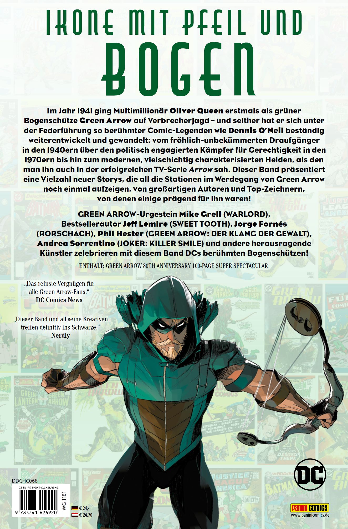 IKONE MIT PFEIL UND BOGEN Im Jahr 1941 ging Multimillionär Oliver Queen erstmals als grüner Bogenschütze Green Arrow auf Verbrecherjagd - und seither hat er sich unter der Federführung so berühmter Comic-Legenden wie Dennis O'Neil beständig weiterentwickelt und gewandelt: vom fröhlich-unbekümmerten Draufgänger in den 1940ern über den politisch engagierten Kämpfer für Gerechtigkeit in den 1970ern bis hin zum modernen, vielschichtig charakterisierten Helden, als den man ihn auch in der erfolgreichen TV-Serie Arrow sah. Dieser Band präsentiert eine Vielzahl neuer Storys, die all die Stationen im Werdegang von Green Arrow noch einmal aufzeigen, von großartigen Autoren und Top-Zeichnern, von denen einige prägend für ihn waren!GREEN ARROW-Urgestein Mike Grell (WARLORD), Bestsellerautor Jeff Lemire (SWEET TOOTH), Jorge Fornés (RORSCHACH), Phil Hester (GREEN ARROW: DER KLANG DER GEWALT), Andrea Sorrentino (JOKER: KILLER SMILE) und andere herausragende Künstler zelebrieren mit diesem Band DCs berühmten Bogenschützen!ENTHÄLT: GREEN ARROW 80TH ANNIVERSARY 100-PAGE SUPER SPECTACULAR