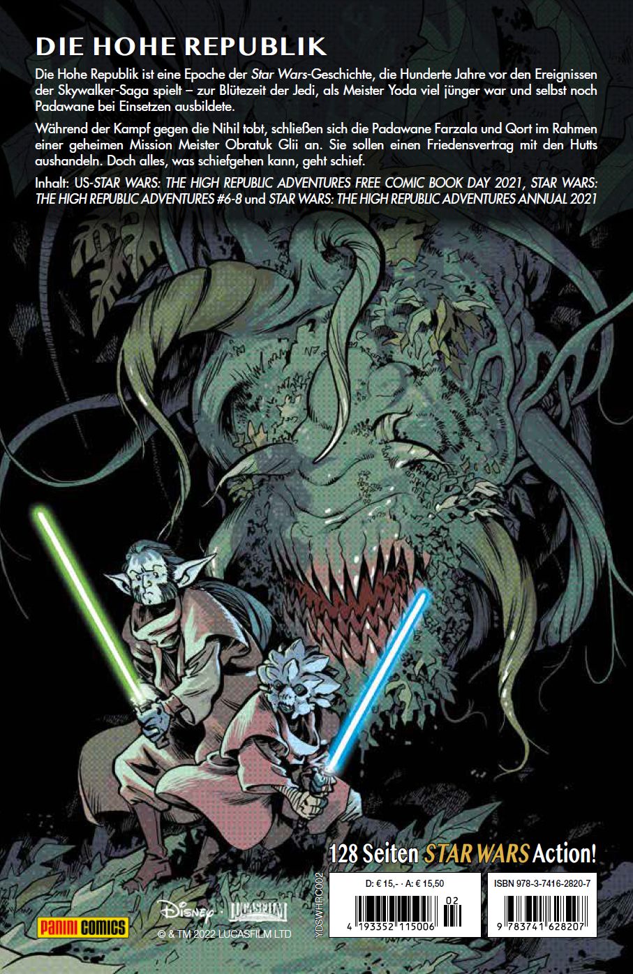 DIE HOHE REPUBLIKDie Hohe Republik ist eine Epoche der Star Wars-Geschichte, die Hunderte Jahre vor den Ereignissen der Skywalker-Saga spielt - zur Blütezeit der Jedi, als Meister Yoda viel jünger war und selbst noch Padawane bei Einsetzen ausbildete.Während der Kampf gegen die Nihil tobt, schließen sich die Padawane Farzala und Qort im Rahmen einer geheimen Mission Meister Obratuk Glii an. Sie sollen einen Friedensvertrag mit den Hutts aushandeln. Doch alles, was schiefgehen kann, geht schief.Inhalt: US-STAR WARS: THE HIGH REPUBLIC ADVENTURES FREE COMIC BOOK DAY 2021, STAR WARS: THE HIGH REPUBLIC ADVENTURES #6-8 und STAR WARS: THE HIGH REPUBLIC ADVENTURES ANNUAL 2021
