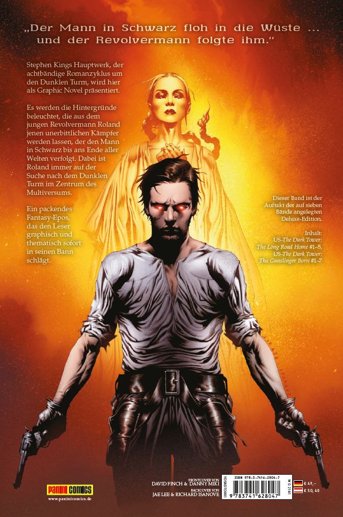 Stephen Kings Hauptwerk, die siebenbändige Sage um den dunklen Turm, wird hier als Graphic Novel fortgesetzt. Es werden die Hintergründe offenbart, die aus dem jungen Revolvermann Roland jenen unerbittlichen Kämpfer werden lassen, der den Mann in Schwarz bis ans Ende aller Welten verfolgt. Dabei ist Roland immer auf der Suche nach dem Dunklen Turm. Ein packendes Fantasy-Epos, das den Leser graphisch und thematisch sofort in seinen Bann schlägt.Dieser Band ist der Auftakt der auf sieben Bände angelegten Deluxe-Edition.