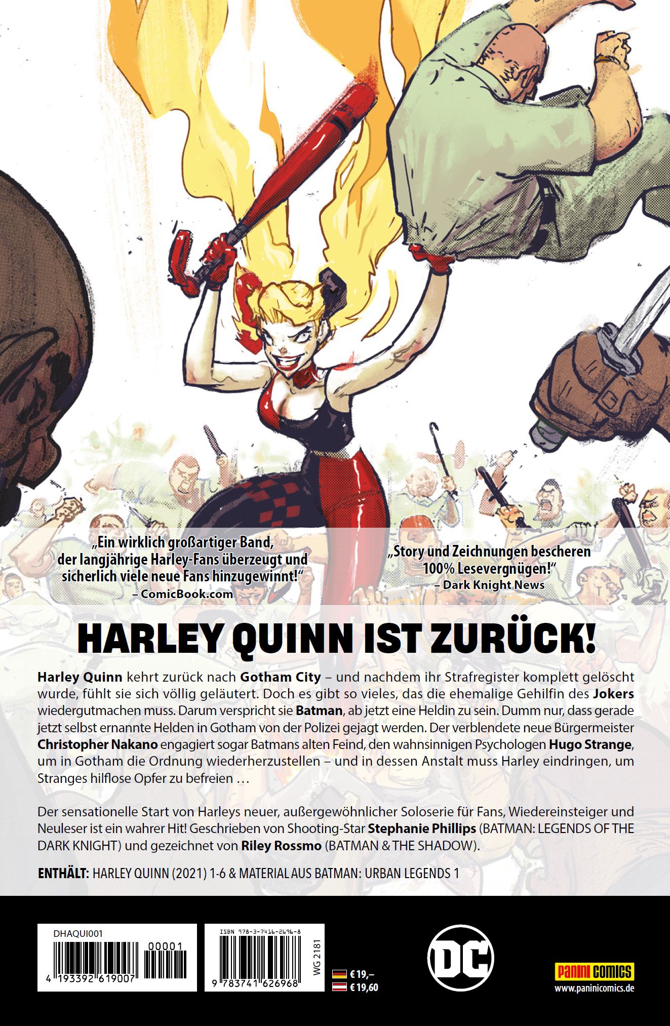 HARLEY QUINN IST ZURÜCK!Harley Quinn kehrt zurück nach Gotham City - und nachdem ihr Strafregister komplett gelöscht wurde, fühlt sie sich völlig geläutert. Doch es gibt so vieles, das die ehemalige Gehilfin des Jokers wiedergutmachen muss. Darum verspricht sie Batman, ab jetzt eine Heldin zu sein. Dumm nur, dass gerade jetzt selbsternannte Helden in Gotham von der Polizei gejagt werden. Der verblendete neue Bürgermeister Christopher Nakano engagiert sogar Batmans alten Feind, den wahnsinnigen Psychologen Hugo Strange, um in Gotham die Ordnung wiederherzustellen - und in dessen Anstalt muss Harley eindringen, um Stranges hilflose Opfer zu befreien ...Der sensationelle Start von Harleys neuer, außergewöhnlicher Soloserie für Fans, Wiedereinsteiger und Neuleser ist ein wahrer Hit! Geschrieben von Shooting-Star Stephanie Phillips (BATMAN: LEGENDS OF THE DARK KNIGHT) und gezeichnet von Riley Rossmo (BATMAN & THE SHADOW).ENTHÄLT: HARLEY QUINN (2021) 1-6 UND MATERIAL AUS BATMAN: URBAN LEGENDS 1