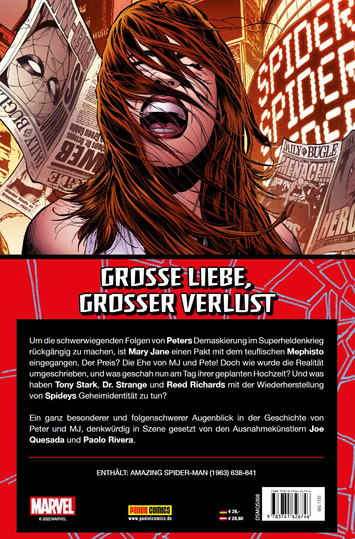 GROSSE LIEBE, GROSSER VERLUST Um die schwerwiegenden Folgen von Peters Demaskierung im Superheldenkrieg rückgängig zu machen, ist Mary Jane einen Pakt mit dem teuflischen Mephisto eingegangen. Der Preis? Die Ehe von MJ und Pete! Doch wie wurde die Realität umgeschrieben, und was geschah nun am Tag ihrer geplanten Hochzeit? Und was haben Tony Stark, Dr. Strange und Reed Richards mit der Wiederherstellung von Spideys Geheimidentität zu tun? Ein ganz besonderer und folgenschwerer Augenblick in der Geschichte von Peter und MJ, denkwürdig in Szene gesetzt von den Ausnahmekünstlern Joe Quesada und Paolo Rivera. ENTHÄLT: AMAZING SPIDER-MAN (1963) 638-641