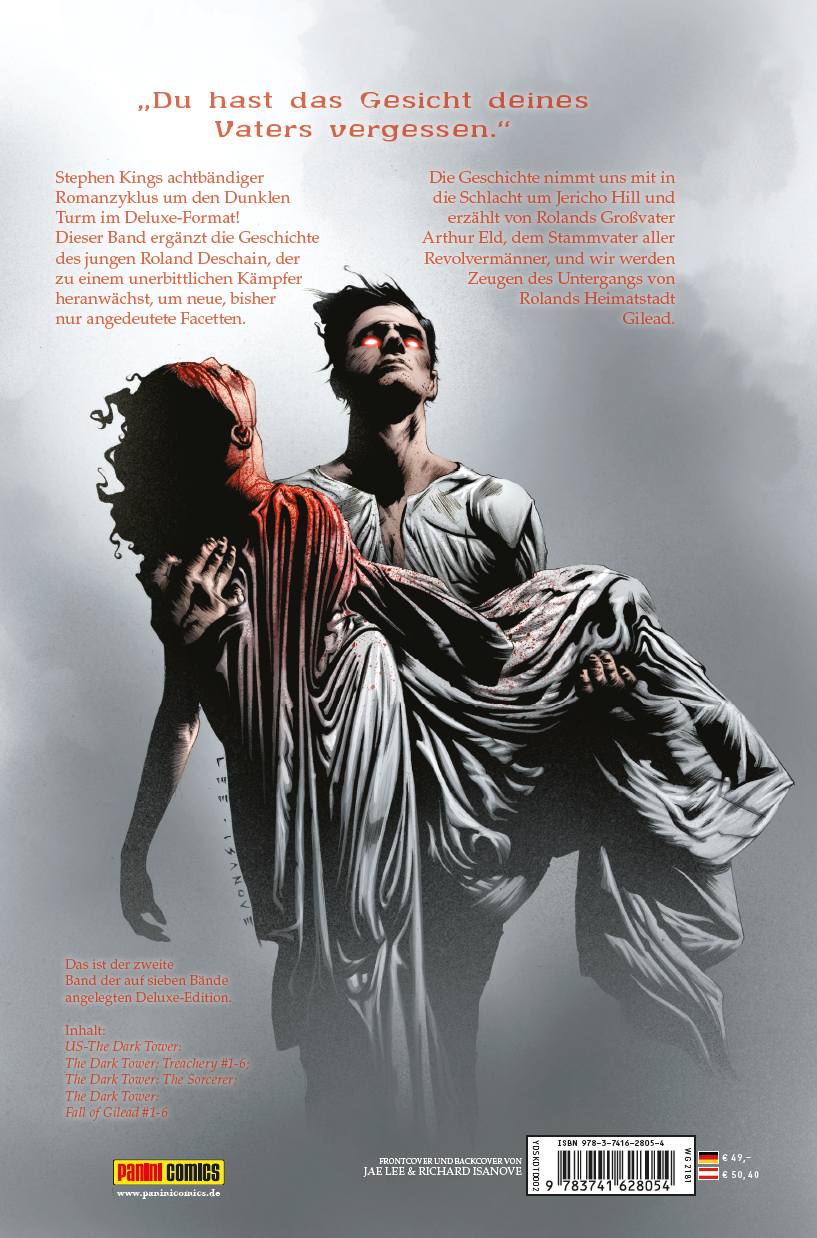 "Du hast das Gesicht deines Vaters vergessen." Stephen Kings achtbändiger Romanzyklus um den Dunklen Turm im Deluxe-Format! Dieser Band ergänzt die Geschichte des jungen Roland Deschain, der zu einem unerbittlichen Kämpfer heranwächst, um neue, bisher nur angedeutete Facetten. Die Geschichte nimmt uns mit in die Schlacht um Jericho Hill und erzählt von Rolands Großvater Arthur Eld, dem Stammvater aller Revolvermänner, und wir werden Zeugen des Untergangs von Rolands Heimatstadt Gilead.Das ist der zweite Band der auf sieben Bände angelegten Deluxe-Edition.Inhalt: US-The Dark Tower: The Dark Tower: Treachery #1-6; The Dark Tower: The Sorcerer; The Dark Tower: Fall of Gilead #1-6