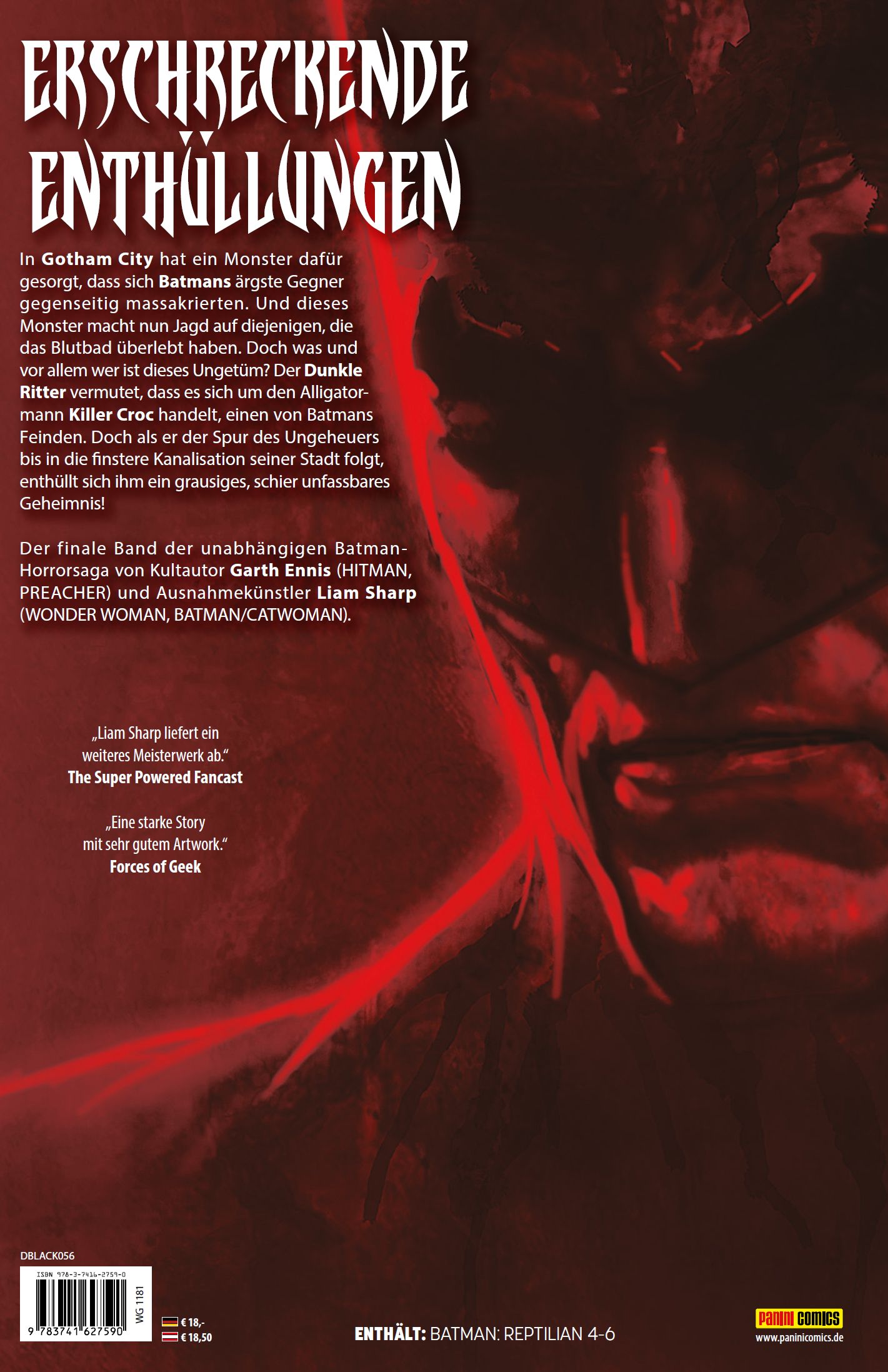 DIE MONSTER VON GOTHAM von Christian Endres Ein Treffen zwischen dem Joker, Scarecrow, dem Pinguin und anderen Superkriminellen war völlig außer Kontrolle geraten. Batmans altbekannte Gegner und ihre Schergen waren total ausgerastet und wie die Tiere aufeinander losgegangen. Indem er Scarecrows rechte Hand einschüchterte, erfuhr der Dunkle Ritter alles über das Treffen, das in ein Massaker ausartete: dass bei der kriminellen Zusammenkunft plötzlich irgendetwas buchstäblich in der Luft gelegen habe, was die Ganoven durchdrehen und einander an die Gurgel gehen ließ. Doch das war noch nicht alles. Später jagte ein Monster alle, die das Blutbad überlebt hatten. Der Mitternachtsdetektiv befragte auch den übel zugerichteten Pinguin und nahm obendrein eine Blutprobe. Die analysierte er mithilfe des Bat-Computers und stellte fest, dass das Monstrum eine große Menge Pheromone im Kreislauf des kriminellen Vogels zurückgelassen hat. Am ehesten lässt sich das Östrogen mit einem großen Reptil vergleichen, etwa einem schwangeren Krokodil. Das brachte Batman auf seinen alten Feind, den Alligatormann Waylon Jones, auch bekannt als Killer Croc. Das Monstrum, das sich gern in der Kanalisation versteckt, gibt im unabhängigen Kanon dieser Geschichte selbst dem Dunklen Ritter Rätsel auf. War Croc ein Mensch, der zum Reptil mutierte, oder eine mutierte Echse? Oder gar eine Spezies für sich, wie Bruce Waynes Butler Alfred Pennyworth mutmaßte? Ehe Batman der Sache weiter nachgehen konnte, nahm der Joker, noch durchgeknallter als ohnehin, im Botanischen Garten von Gotham mehrere Geiseln. Batman und die Cops um Commissioner Jim Gordon zogen sofort los und stellten den axtschwingenden Killerclown. Batman stieg dabei in eine Grotte und kam darauf, dass das Reptil, das er jagt, das Abwassersystem unter Gotham benutzt, um sich ungesehen fortzubewegen. Also doch Croc? Das wird dieser finale Band der eigenständigen Horrorsaga von Star-Autor Garth Ennis und Top-Künstler Liam Sharp zeigen …