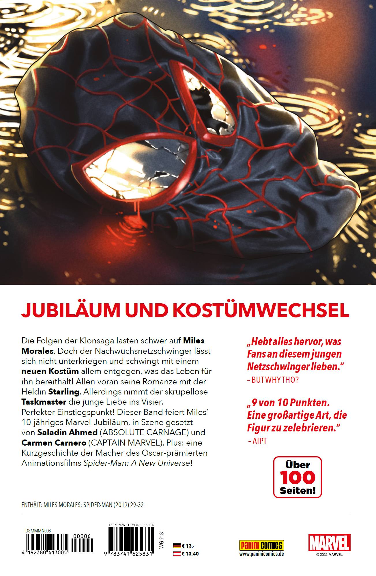 VORWORT von Christian EndresMiles Morales ist nicht nur ein Nachwuchsnetzschwinger, sondern der Spider-Man der nächsten Generation! Comics, Videogames, Animationsfilme - Miles hat das Marvel-Universum im Sturm erobert. Dieser einsteigerfreundliche Band seiner Comic-Soloserie feiert das 10-jährige Marvel- Jubiläum von Miles, der 2011 in einer Story von US-Autor Brian Michael Bendis und der italienischen Zeichnerin Sara Pichelli debütierte. Es ergibt daher mehr als nur Sinn, dass Pichelli eine Kurzgeschichte zu diesem Jubiläumsband beigetragen hat - genauso wie Phil Lord, Christopher Miller und Kemp Powers, die sich um die erfolgreichen, sogar schon mit dem Oscar prämierten Spider-Verse- Animationsfilme über Miles und Co. kümmern. Mit Chris Allen begrüßen wir darüber hinaus einen weiteren neuen Stammzeichner an MILES MORALES: SPIDER-MAN. Autor bleibt dagegen nach wie vor Saladin Ahmed. Im vorangegangenen Band sorgte Miles' ganz persönliche Klonsaga für viel Aufregung, Stress und Leid. Miles und seine Baby- Schwester Billie wären sogar fast gestorben - und während Selim der böseste Klon von allen war, rettete ausgerechnet der monströse Shift Billie. Miles' schwarz-roter Spidey-Dress musste in den Wirren dieser Klonsaga allerdings dran glauben. Nach so viel Drama ist es wohl ganz normal, dass ein junger Held, bei aller Kraft und Verantwortung, schon mal ins Zweifeln kommt - zumal sein größtenteils geheimes Doppelleben als Spidey und als Schüler der Visions Academy in Brooklyn zuweilen ziemlich kompliziert werden kann. Zum Glück kann sich Miles immer auf seinen besten Kumpel Ganke verlassen (der Vorlage für Ned Leeds in den Spider-Man-Filmen mit Tom Holland). Und dann ist da ja noch Tiana Toomes, die Enkelin des langjährigen Superschurken Vulture alias Geier, die als geflügelte Heldin Starling allerdings auf der Seite des Guten steht - und seit Kurzem die wahre Identität unseres Wandkrabblers kennt. Ist aber besser so, denn Miles' Herz schlägt jedes Mal schneller, wenn er sie anfliegen sieht ......