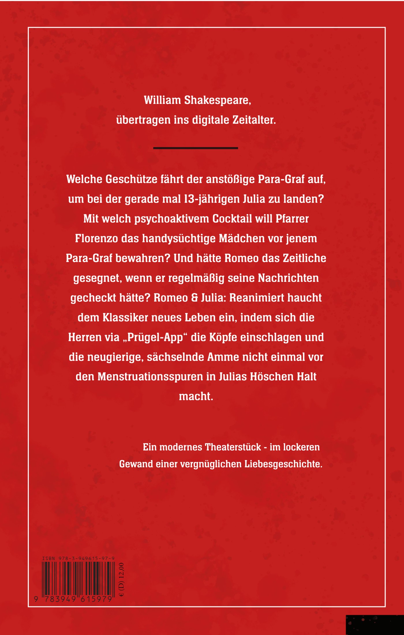 Welche Geschütze fährt der anstößige Pra-Graf auf, um bei der gerade mal 13-jährigen Julia zu landen? Mit welch psychoaktivem Cocktail will Pfarrer Florenzo das handysüchtige Mädchen vor jenem Para-Graf bewahren? Und hätte Romeo das Zeitliche gesegnet, wenn er regelmäßig seine Nachrichten gecheckt hätte? Romeo und Julia: Reanimiert haucht dem Klassiker neues Leben ein, indem sich die Herren via „Prügel-App” die Köpfe einschlagen und die neugierige, sächselnde Amme nicht einmal vor Menstruationsspuren in Julias Höschen Halt macht.