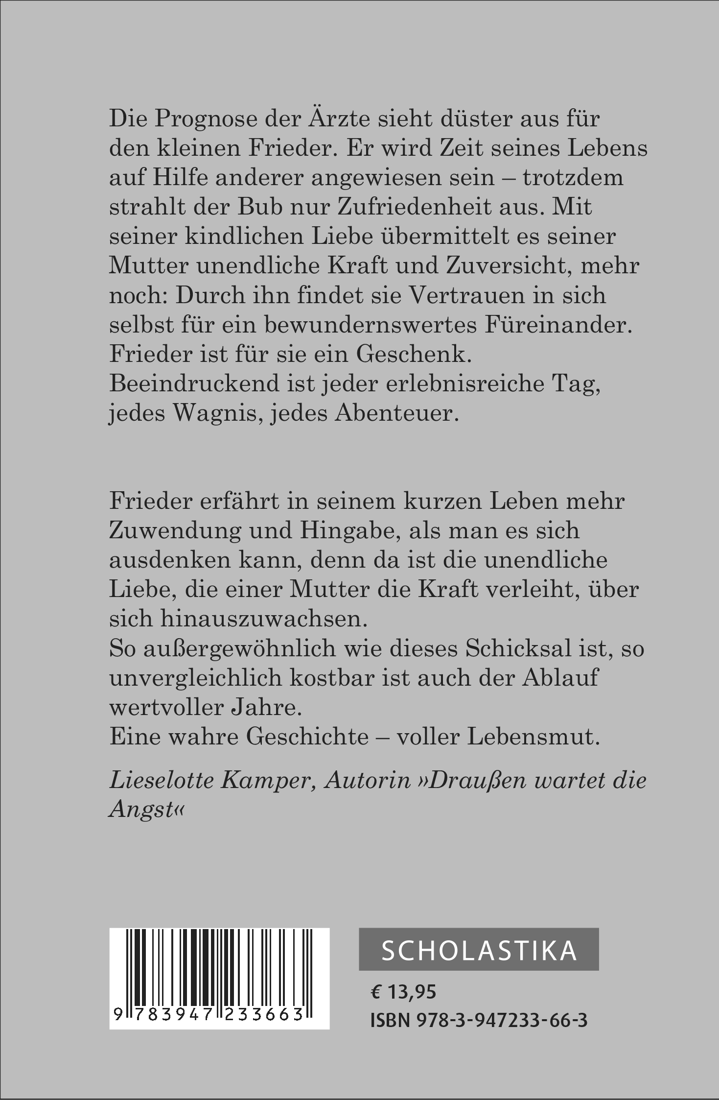 Die Prognose der Ärzte sieht düster aus für den kleinen Frieder. Er wird Zeit seines Lebens auf Hilfe anderer angewiesen sein - trotzdem strahlt der Bub nur Zufriedenheit aus. Mit seiner kindlichen Liebe übermittelt es seiner Mutter unendliche Kraft und Zuversicht, mehr noch: Durch ihn findet sie Vertrauen in sich selbst für ein bewundernswertes Füreinander. Frieder ist für sie ein Geschenk. Beeindruckend ist jeder erlebnisreiche Tag, jedes Wagnis, jedes Abenteuer.Frieder erfährt in seinem kurzen Leben mehr Zuwendung und Hingabe, als man es sichausdenken kann, denn da ist die unendliche Liebe, die einer Mutter die Kraft verleiht, über sich hinauszuwachsen.So außergewöhnlich wie dieses Schicksal ist, so unvergleichlich kostbar ist auch der Ablauf wertvoller Jahre.Eine wahre Geschichte - voller Lebensmut. Lieselotte Kamper, Autorin »Draußen wartet die Angst«