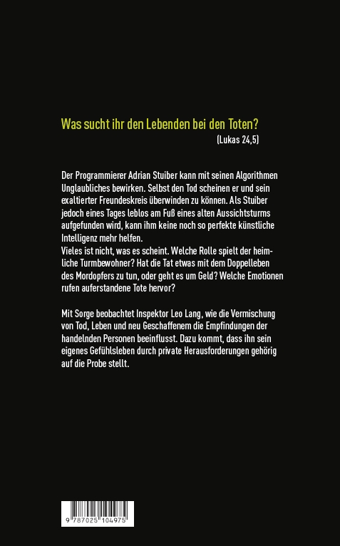 Was sucht ihr den Lebenden bei den Toten? (Lukas 24,5)Der Programmierer Adrian Stuiber kann mit seinen Algorithmen Unglaubliches bewirken. Selbst den Tod scheinen er und sein exaltierter Freundeskreis überwinden zu können. Sie kreieren neue perfekte Geschöpfe. Als Stuiber jedoch eines Tages leblos am Fuß eines alten Aussichtsturms aufgefunden wird, kann ihm kein Algorithmus mehr helfen. Der Griff nach den Göttern endete für ihn mit einem ganz und gar realen, tiefen Fall.Vieles ist nicht, was es scheint. Welche Rolle spielt der heimliche Turmbewohner? Hat die Tat etwas mit dem Doppelleben des Mordopfers zu tun, oder geht es um Geld? Die Vermischung von Tod, Leben und neu Geschaffenem ist nicht die einzige Lüge, die es aufzudecken gilt.Der "eiskalte Yuppieverein", zu dem der Ermordete gehörte, ruft bei Chefinspektor Leo Lang und seinem Team keine Sympathien hervor. "De ham olle an Huscher", diagnostiziert der dienstälteste Kollege Nowotny, doch das hilft auch nicht weiter. Mit Sorge beobachtet Lang, wie künstliche Intelligenz das Gefühlsleben derer, die sie nutzen, beeinflusst. Dazu kommt, dass ihn sein eigenes Gefühlsleben durch private Herausforderungen gehörig auf die Probe stellt.