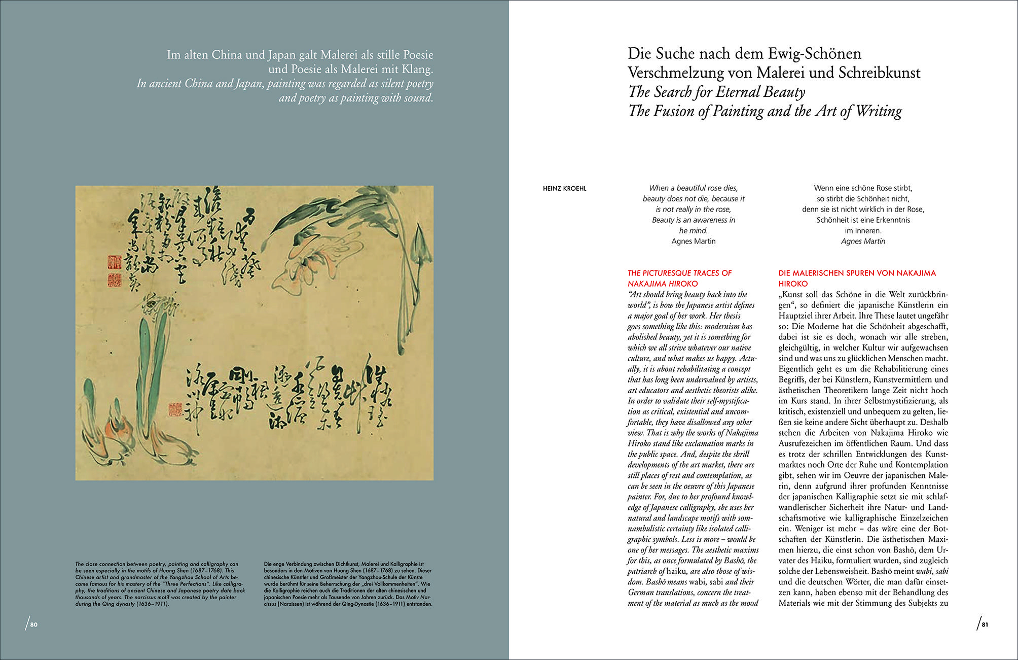 Wie kann die Interpretation einer Zen-Weisheit, eines Haiku-Gedichts oder einer Naturbeschreibung visualisiert werden? Um das enge Verhältnis von Bild und Schrift, Malerei und Poesie kreisen rund 30 Kunstwerke japanischer Sho-Künstlerinnen und -Künstler. Im Tanz des Pinsels beim Auftrag der Tusche auf das Papier entstehen Dynamik, Rhythmus und kunstvolle Schattierungen. Fundierte Essays entschlüsseln die Zeichensprache, Kalligrafie, Schreibkunst und globale Ausstrahlung der opulent abgebildeten Werke.