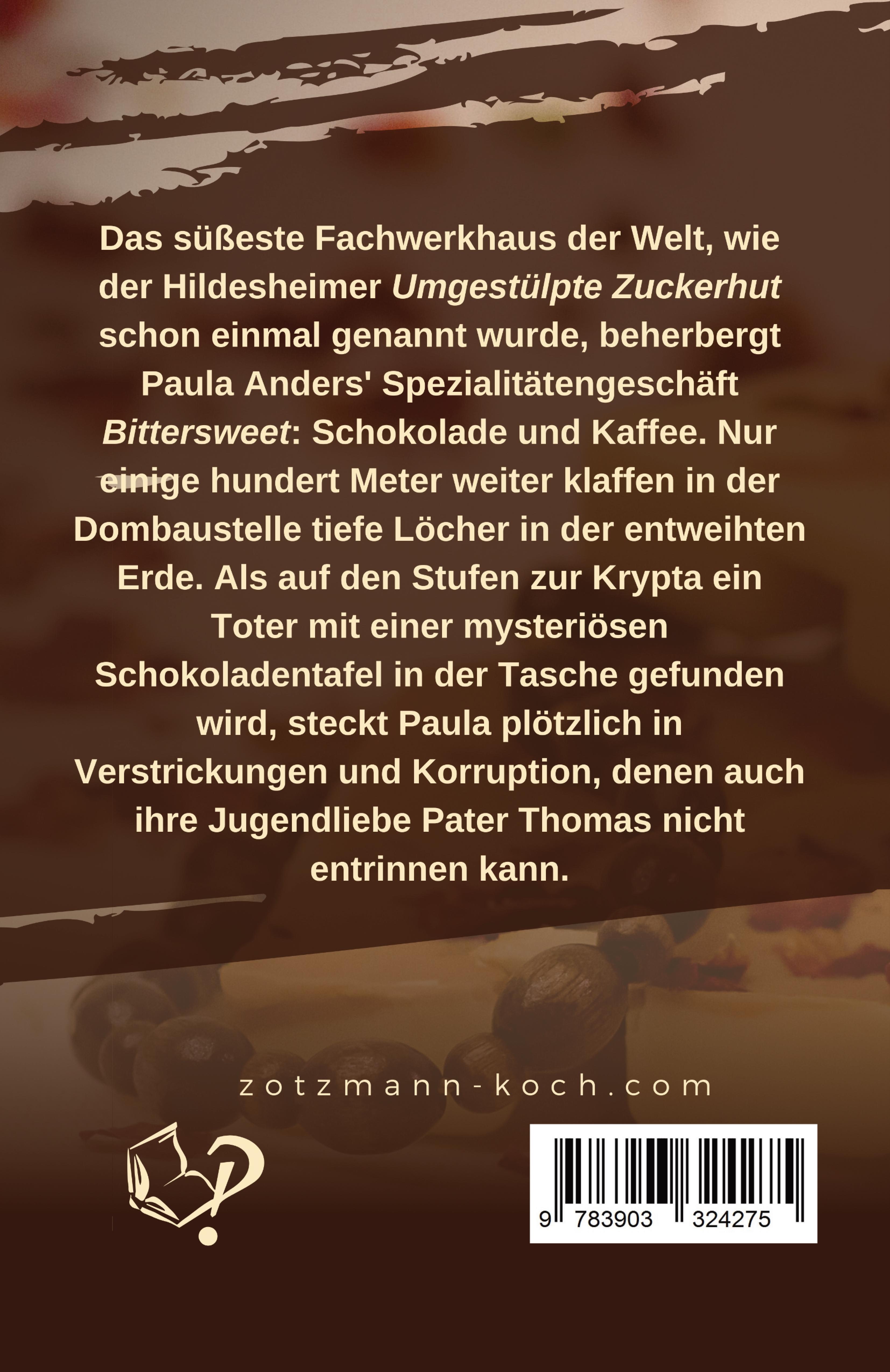 Das süßeste Fachwerkhaus der Welt, wie der Hildesheimer Umgestülpte Zuckerhut schon einmal genannt wurde, beherbergt Paula Anders' Spezialitätengeschäft Bittersweet: Schokolade und Kaffee. Nur einige hundert Meter weiter klaffen in der Dombaustelle tiefe Löcher in der entweihten Erde. Als auf den Stufen zur Krypta ein Toter mit einer mysteriösen Schokoladentafel in der Tasche gefunden wird, steckt Paula plötzlich in Verstrickungen und Korruption, denen auch ihre Jugendliebe Pater Thomas nicht entrinnen kann.