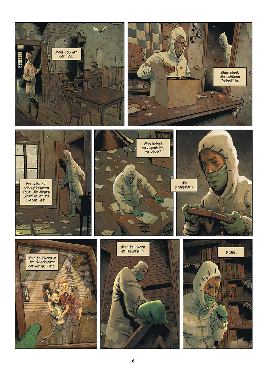 Menschen sterben, und manchmal sterben Menschen unbemerkt in ihrer Wohnung, ohne Familie und Angehörige. Dann kommen Derrick und seine Kollegen ins Spiel: Im Auftrag einer halbseidenen Firma verschaffen sie sich diskret Zugang zu den Häusern der Toten und beseitigen ihre sterblichen Überreste. Manchmal treffen sie erst Wochen oder Monate nach dem Tod ein - eine unappetitliche Angelegenheit. Die sich aber lohnt, denn die inoffiziellen Tatortreiniger entsorgen nicht nur Leichen in diversen Stadien der Verwesung, sondern lassen auch Wertgegenstände mitgehen, die niemand mehr vermisst. Ahmed ist neu in diesem Job, und als Feuertaufe steht ein ungezieferverseuchter Slum auf seinem Dienstplan, in dem zwei Leichen seit fünf Jahren vor sich hin rotten... Sie mögen ihre Krimis dreckig, radikal und realistisch? Blut und Exkremente schocken Sie nicht? Und menschliche Abgründe starren Sie einfach nieder? Willkommen bei »RIP«, einer Comicserie, deren düstere Atmosphäre mit knallharten Stories Hand in Hand geht, um die Portraits von sechs Menschen zu zeichnen, deren Schicksal nur wenig besser ist als das derer, die von ihnen ausgeraubt werden.