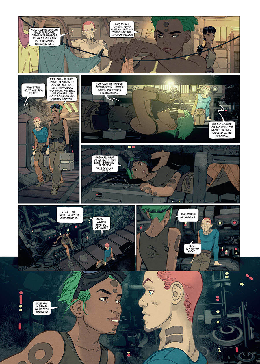 Nachdem sie Opfer eines bislang unbekannten Weltraumphänomens wurden, sind Polly, Mark, Adya, Qsi und Oot-Jah mitsamt ihrem Forschungsschiff, der Thukydides, verschollen. Wegen Verrats wurde der Dekan der Akademie der Universellen Historischen Wissenschaften von seinen Aufgaben als Leiter ihrer Expedition entbunden, daher sind die Studierenden auf sich selbst gestellt. Ohne zu wissen, wo und auf welcher Zeitebene sie sich befinden, kreuzen sie ziellos durchs All, bis sie auf ein scheinbar verlassenes Raumschiff stoßen. Polly und Mark entdecken innerhalb des Wracks einen tief schlafenden menschlichen Überlebenden, der vielleicht ein paar Antworten auf ihre Fragen hat... Für deutschsprachige Leser ist Ingo Römling synonym mit »Malcolm Max«, dem charismatischen Dämonenjäger, dessen von Peter Mennigen erdachte Geschichten vom Berliner Zeichner brillant ins Bild gesetzt werden. Zusammen mit Richard Marazano (»Der Schimpansenkomplex«, »Die drei Geister von Tesla«) erobert Römling jetzt auch die Comic-Szene der Grande Nation - und wir sind dabei!