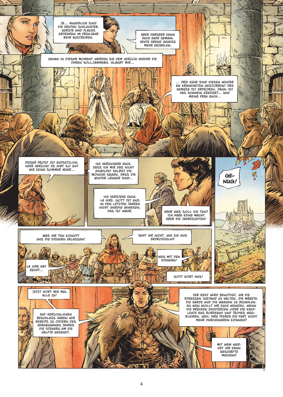 Während Tristan von Halsburg einen winterlichen Feldzug im Land der Wikinger führt, verwalten seine Schwester Ombeline und ihr Ehemann sein Herzogtum. Doch Zwietracht erwächst allerorts, sowohl zwischen den Fürsten und den Bauern als auch zwischen Judiths Gefolgsleuten und jenen der Horde. Und im Osten lauert weiterhin Gefahr durch den machtgierigen Thierry... Hört die Legende des Fahrenden Ritters! Mit seiner ersten Reihe im Fantasy-Genre eroberte der seinerseits legendäre Comic-Künstler Yves Swolfs (»Durango«, »Der Prinz der Nacht«, »Lonesome«) aus dem Stand die Bestsellerlisten. Weniger High Fantasy à la Tolkien als vielmehr düstere Phantastik im Stile Sapkowskis ist »Legende« ein zeitloses Werk über den Kampf zwischen Gut, Böse und der bestialischen Natur des Menschen, das von Swolfs erzählerisch wie zeichnerisch brillant umgesetzt wird. Splitter veröffentlicht die überarbeitete Neuauflage der Bände 1-6 parallel zur Erstveröffentlichung der Folgebände ab Band 7.