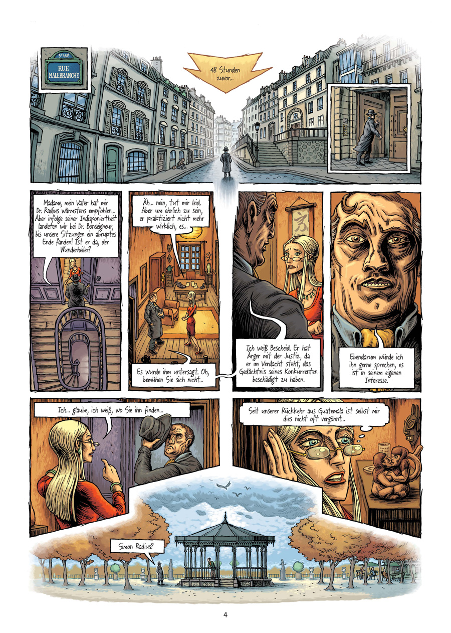 Seit einer heftigen Konfrontation mit seinem betrügerischen »Kollegen« Jean-Lou Bonseigneur hat Simon Radius seine Fähigkeit der Gedankenreise verloren. Zu allem Überdruss macht ihm Bonseigneur auch noch den Prozess, und es sieht nicht gut für Simon aus. Doch da klopft der windige Henri Du Perthuis an Simons Tür und schlägt ihm ein Geschäft vor: Im Austausch für seine Dienste wird die Klage fallengelassen. Im Geist von Henris verwirrtem Vater wartet ein regelrechter Schatz darauf, geborgen zu werden, an den nur Simon Radius kann an ihn gelangen kann... Grafisch genial, klug komponiert und mitreißend ab der ersten Seite: Benoit Dahans Krimi »Psycho Investigator« steht seinem Meisterwerk »Im Kopf von Sherlock Holmes« in keiner Weise nach!