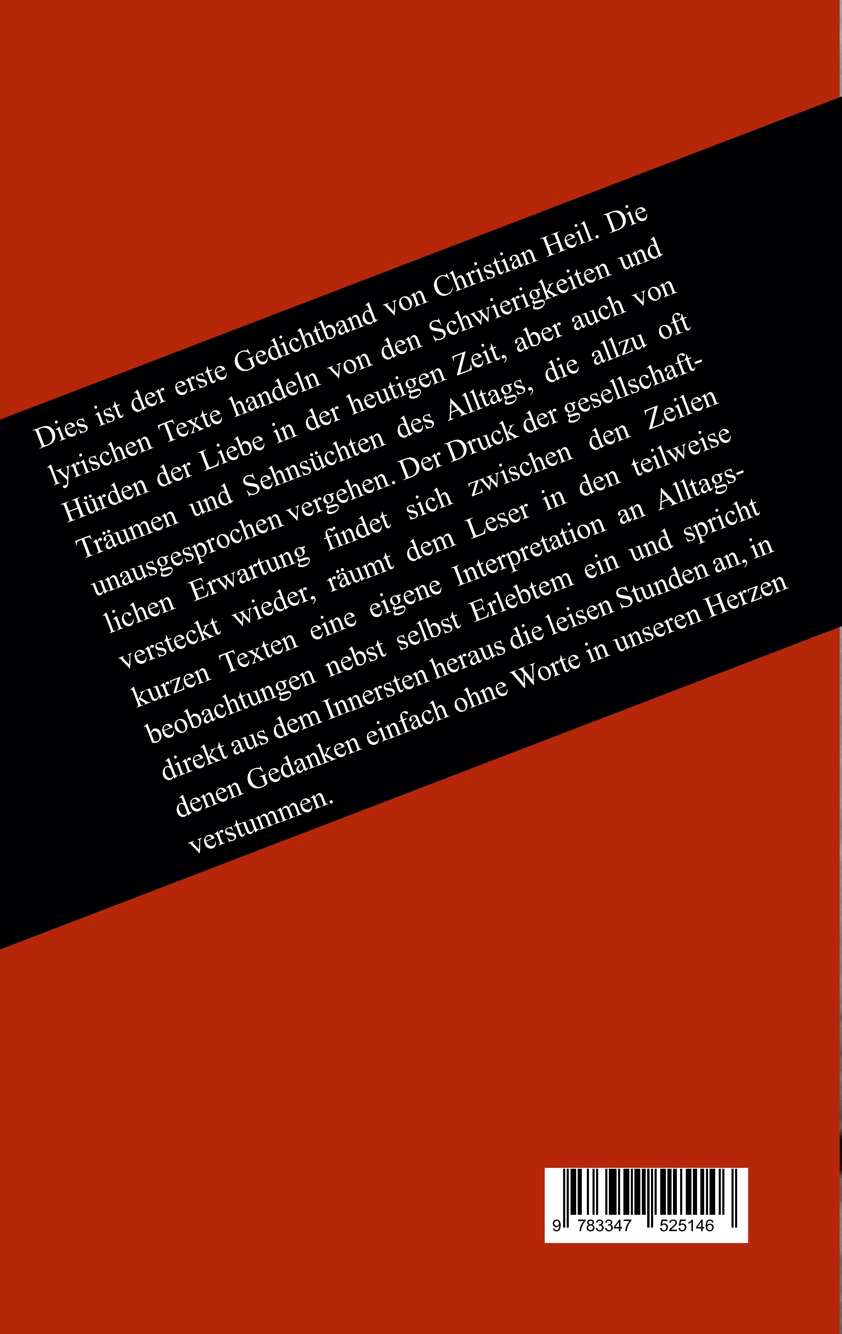 Dies ist der erste Gedichtband von Christian Heil. Die lyrischen Texte handeln von den Schwierigkeiten und Hürden der Liebe in der heutigen Zeit, aber auch von Träumen und Sehnsüchten des Alltags, die allzu oft unausgesprochen vergehen. Der Druck der gesellschaftlichen Erwartung findet sich zwischen den Zeilen versteckt wieder, räumt dem Leser in den teilweise kurzen Texten eine eigene Interpretation an Alltagsbeobachtungen nebst selbst Erlebtem ein und spricht direkt aus dem Innersten heraus die leisen Stunden an, in denen Gedanken einfach ohne Worte in unseren Herzen verstummen.
