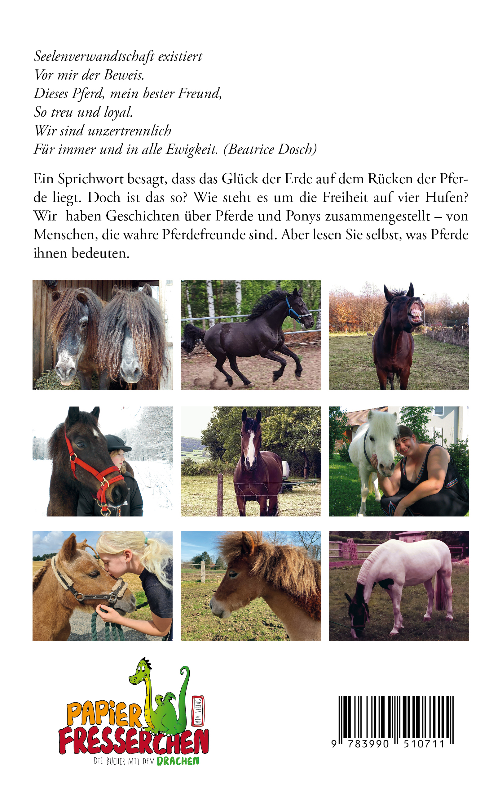 Seelenverwandtschaft existiertVor mir der Beweis.Dieses Pferd, mein bester Freund,So treu und loyal.Wir sind unzertrennlichFür immer und in alle Ewigkeit. (Beatrice Dosch)Ein Sprichwort besagt, dass das Glück der Erde auf dem Rücken der Pferde liegt. Doch ist das so? Wie steht es um die Freiheit auf vier Hufen? Wir haben Geschichten über Pferde und Ponys zusammengestellt - von Menschen, die wahre Pferdefreunde sind. Aber lesen Sie selbst, was Pferde ihnen bedeuten.