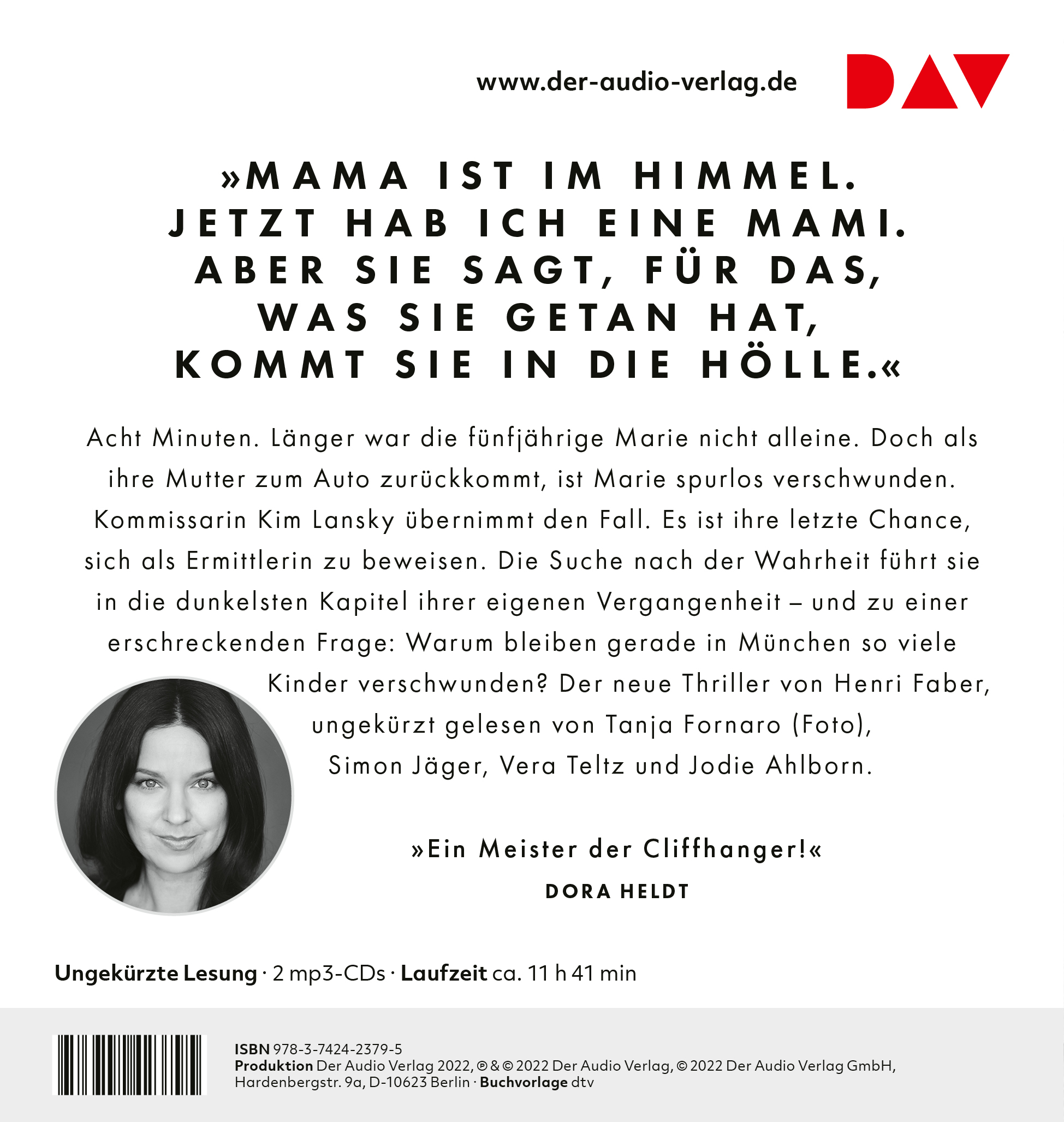 Acht Minuten. Länger war die fünfjährige Marie nicht alleine. Doch als ihre Mutter zum Auto zurückkommt, ist Marie spurlos verschwunden. Kommissarin Kim Lansky übernimmt den Fall. Es ist ihre letzte Chance, sich als Ermittlerin zu beweisen. Die Suche nach der Wahrheit führt sie in die dunkelsten Kapitel ihrer eigenen Vergangenheit – und zu einer erschreckenden Frage: Warum bleiben gerade in München so viele Kinder verschwunden? Der neue Thriller von Henri Faber, ungekürzt gelesen von Tanja Fornaro, Simon Jäger, Vera Teltz und Jodie Ahlborn.