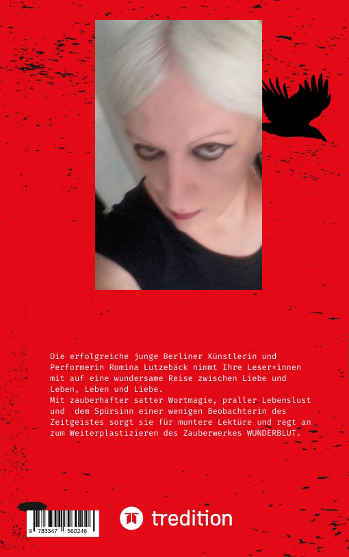 Romina Lutzebäck lebt als Künstlerin und Performerin mit Sezierblick ganz im Hier und Jetzt und entwirft in diesem Format gedehnter Gegenwärtigkeit und im Kontinuum des SOSEINS ihre Zukunft in engster monadischer Mosaik-Verknüpfung mit ihren Mitmenschen und allen anderen Wesen im bunten Spiel des Lebens. Sprachgewalt, Wortmagie, neologistisch anarchische Springfelder inmitten von Wärmedecken, sprudelnden Wasserkochern und lodernden Herdfeuern. Sinngestalt entsteht im Vollzug des Schaffens der Göttin selbst. Ob zeitgenössischer Roman, psychologische Expertise, psychotherapeutische Subvention, pädagogische Hebbammenkunst, Romina serviert stets a la carte und gewährt genüsslich bedingungslosen Nachschlag von der Liebe für die Liebe. Ich bin bewusst, so atme, denke und schreibe ich und springe über die black box mitten ins Sein (Romina Lutzebäck)
